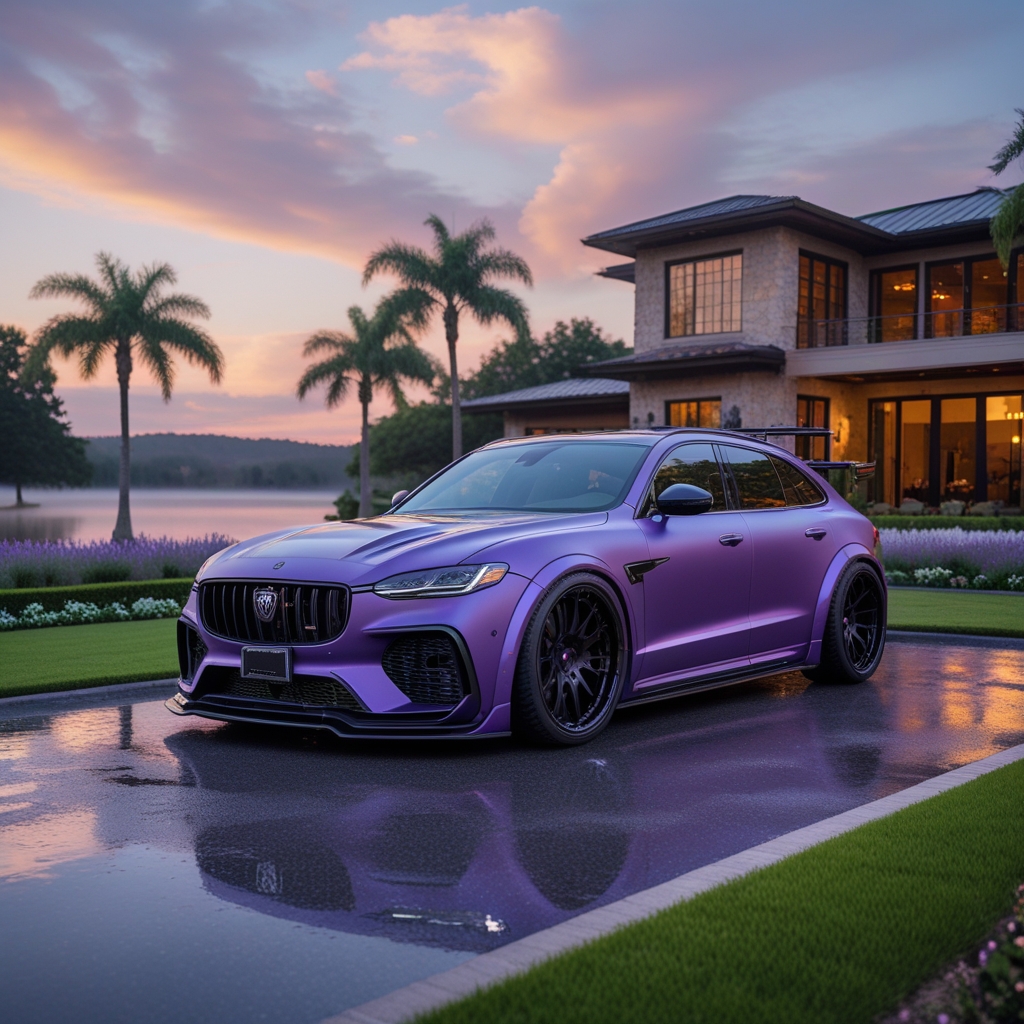 Beautifully landscaped garden surrounding the driveway — manicured green lawn, sculpted hedges, lavender and white flower beds, soft pathway lighting, palm trees gently moving in the breeze. A calm lake in the background reflecting the evening sky. Golden hour lighting with warm sunlight casting dramatic reflections on the violet paint, subtle metallic shimmer, cinematic shadows, high detail, 8K resolution, shallow depth of field, professional automotive photography style, magazine cover quality, ultra sharp focus, HDR, realistic reflections and textures.
