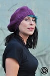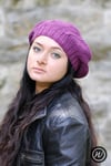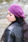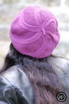 Coldharbour Twist is an interesting beret, knit on the bias with panels of Moss (Seed) Stitch and Stocking Stitch.