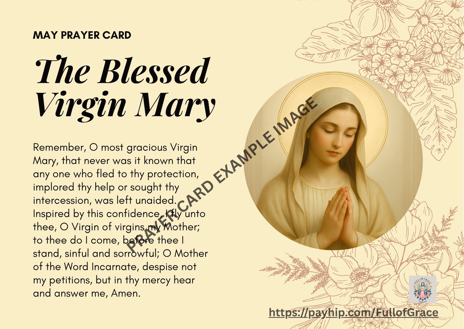 Honor the month dedicated to the Mother of God with this special Catholic prayer card devoted to The Blessed Virgin Mary. May is a time of blossoming grace and tender reflection on Mary’s maternal love, her faithful “yes” to God, and her role as our powerful intercessor.