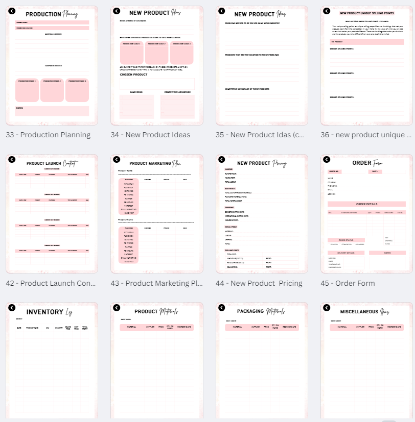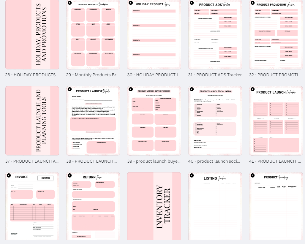 Effortlessly monitor every aspect of your business, from inventory management to financial oversight and much more. With resources for product launches, marketing strategies, financial objectives, and savings tracking, this planner is your essential partner for business growth.