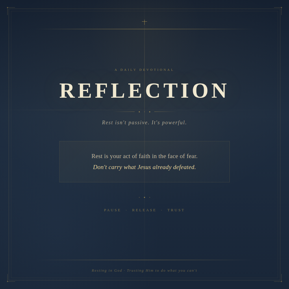 In a world that never stops moving, rest can feel like weakness, but this reflection reminds you that choosing to rest in God is one of the boldest acts of faith you can make. Reflection walks you through the truth that worry lies, burdens aren't yours to carry, and Jesus has already gone before you. This is a gentle and powerful reminder to pause, release, and trust.