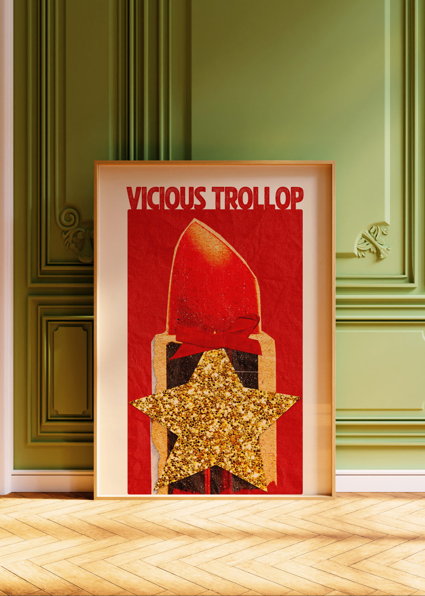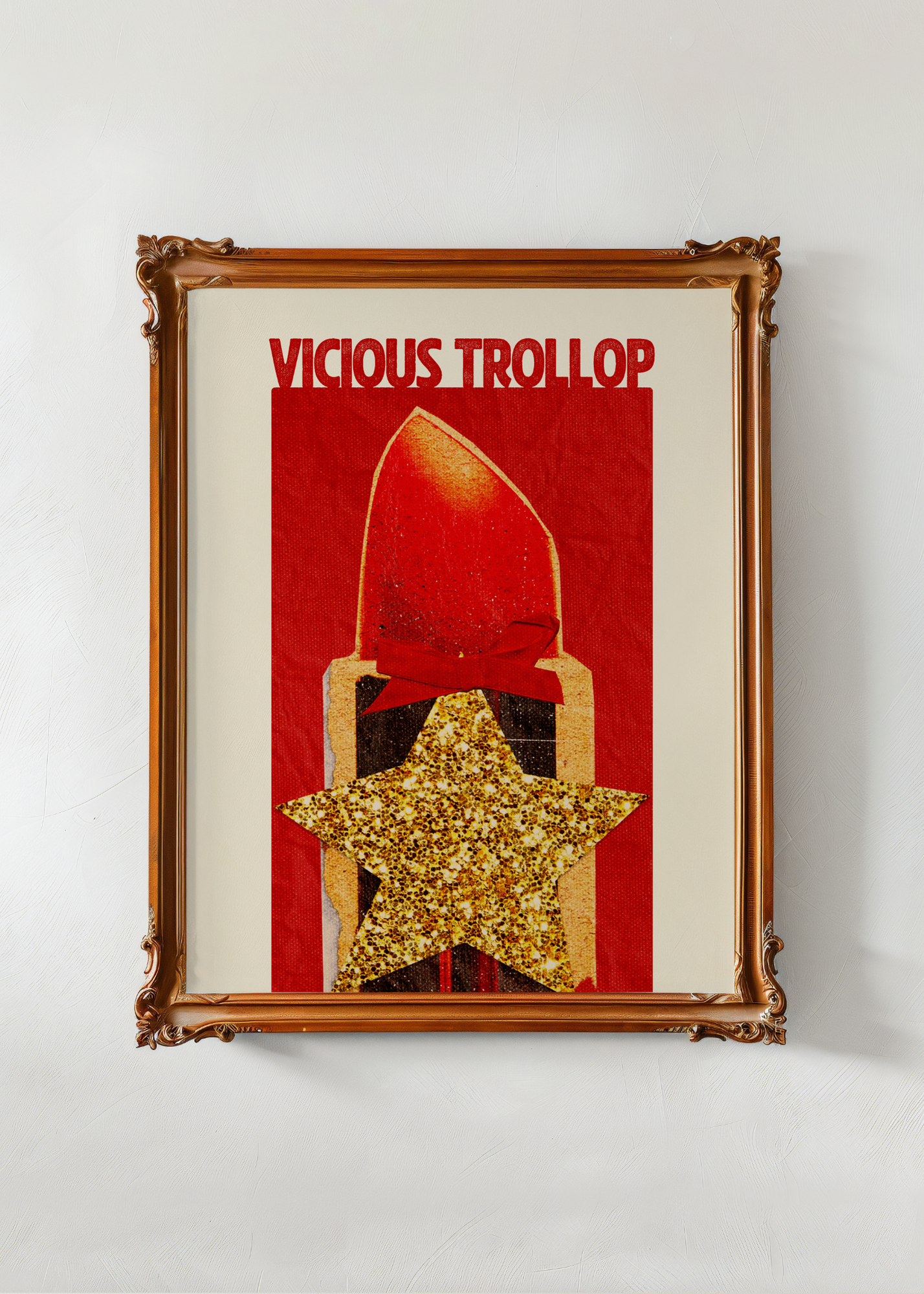 Vicious Trollop— Set against a striking white page, this bold print features a bright red backdrop with the iconic phrase "vicious trollop" above it in matching red block lettering. A loving nod to Gilmore Girls and the unforgettable moment when Emily Gilmore discovers Lorelai's choice of lipstick, this print is equal parts sass and sentiment. Centered on the red is a vivid, up-close red lipstick adorned with a sweet red bow and a glittery gold star—a playful tribute to confidence, rebellion, and the unapologetic glam of Gilmore Girl energy.