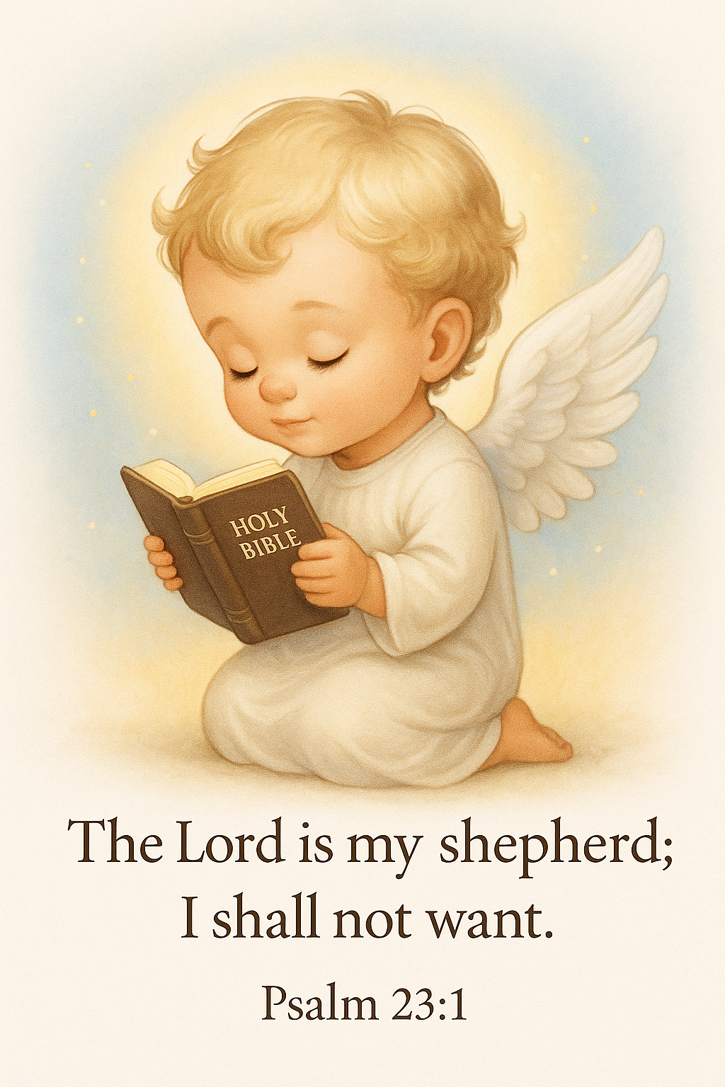 Invite peace and divine guidance into your space with this Child Angel Scripture Poster, featuring a glowing angelic child in quiet devotion with the Holy Bible. Paired with Psalm 23:1, this printable offers reassurance, innocence, and spiritual warmth β perfect for nursery dΓ©cor, devotional kits, or ministry gifts.