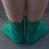 The sock pattern includes instructions for a Pinnacle Border which flows into the geometric Gothic Architecture Lace. An Eye of the Partridge heel flap adds texture. For a simpler pair of socks, the Pinnacle Border can be replaced by a 1x1 rib.