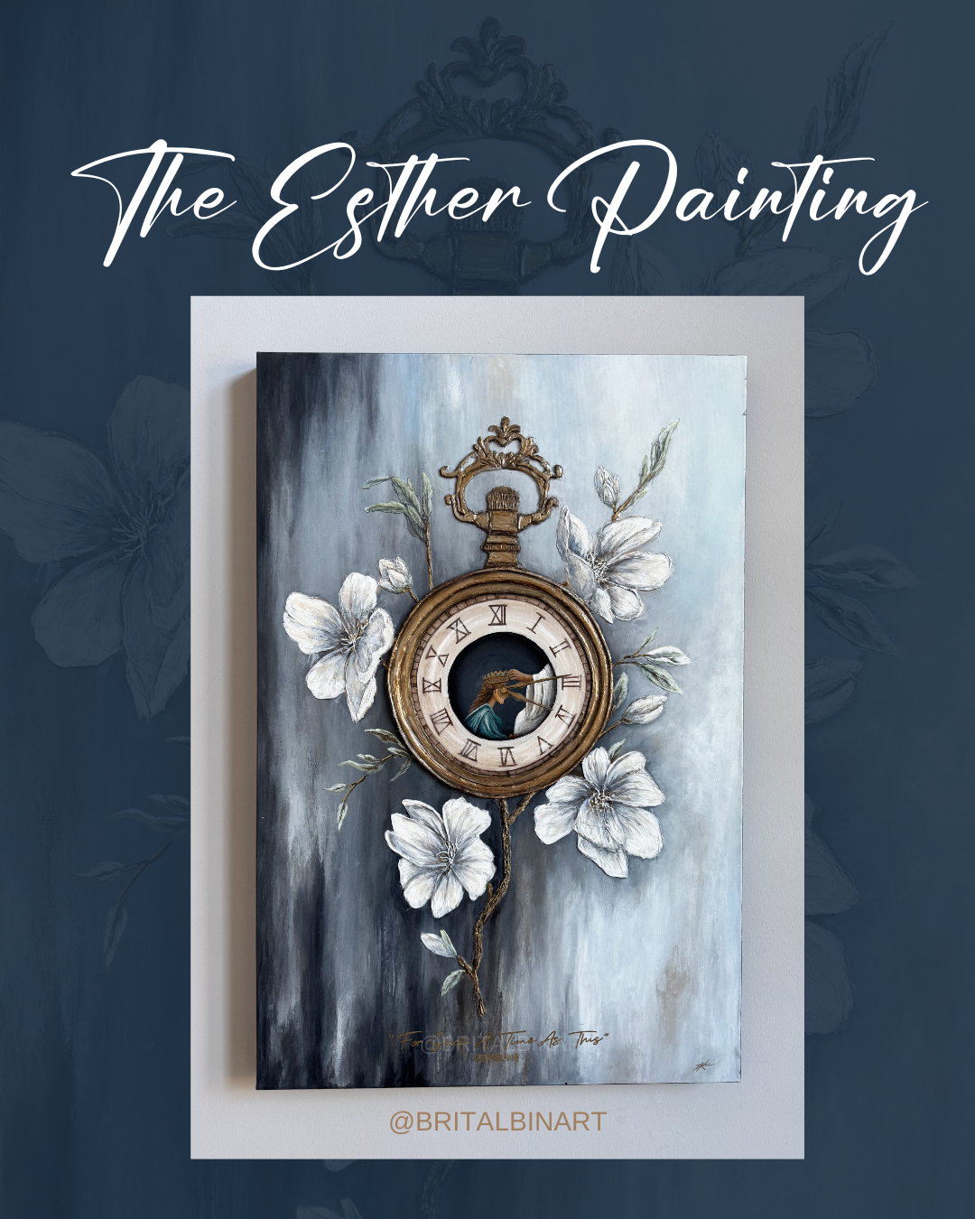 The ornate timepiece represents God’s divine timing, with Esther bowing in humility before the King of Persia and ultimately the King of Kings. Her eyes fixed on the pivotal 4th hour and 14th minute (Esther 4:14). Surrounding her are nine myrtle flowers, symbolizing the fruits of the Spirit she embodied on her mission. The divided background—darkness into light—reflects the weight of her decision to step past fear and into faith, risking everything for God and her people.