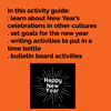 New Year's celebrations and traditions are a vibrant and joyous way to welcome the beginning of a fresh year. Lesson plans focused on this topic can incorporate fun activities that engage students and deepen their understanding of cultural practices. One activity could involve exploring various New Year's customs from around the world, such as the Chinese New Year or the Scottish Hogmanay. Students could create a presentation or poster showcasing the unique traditions, including food, music, and rituals. Another enjoyable activity might be designing personalized calendars for the upcoming year, allowing students to express their creativity while learning about the concept of time and the significance of the New Year. Additionally, organizing a mock countdown to midnight, complete with party hats and confetti, can provide an exciting and interactive way for students to experience the exhilaration of New Year's Eve. These lesson plans and activities combine education with entertainment, fostering cultural appreciation and a sense of anticipation for the year ahead.