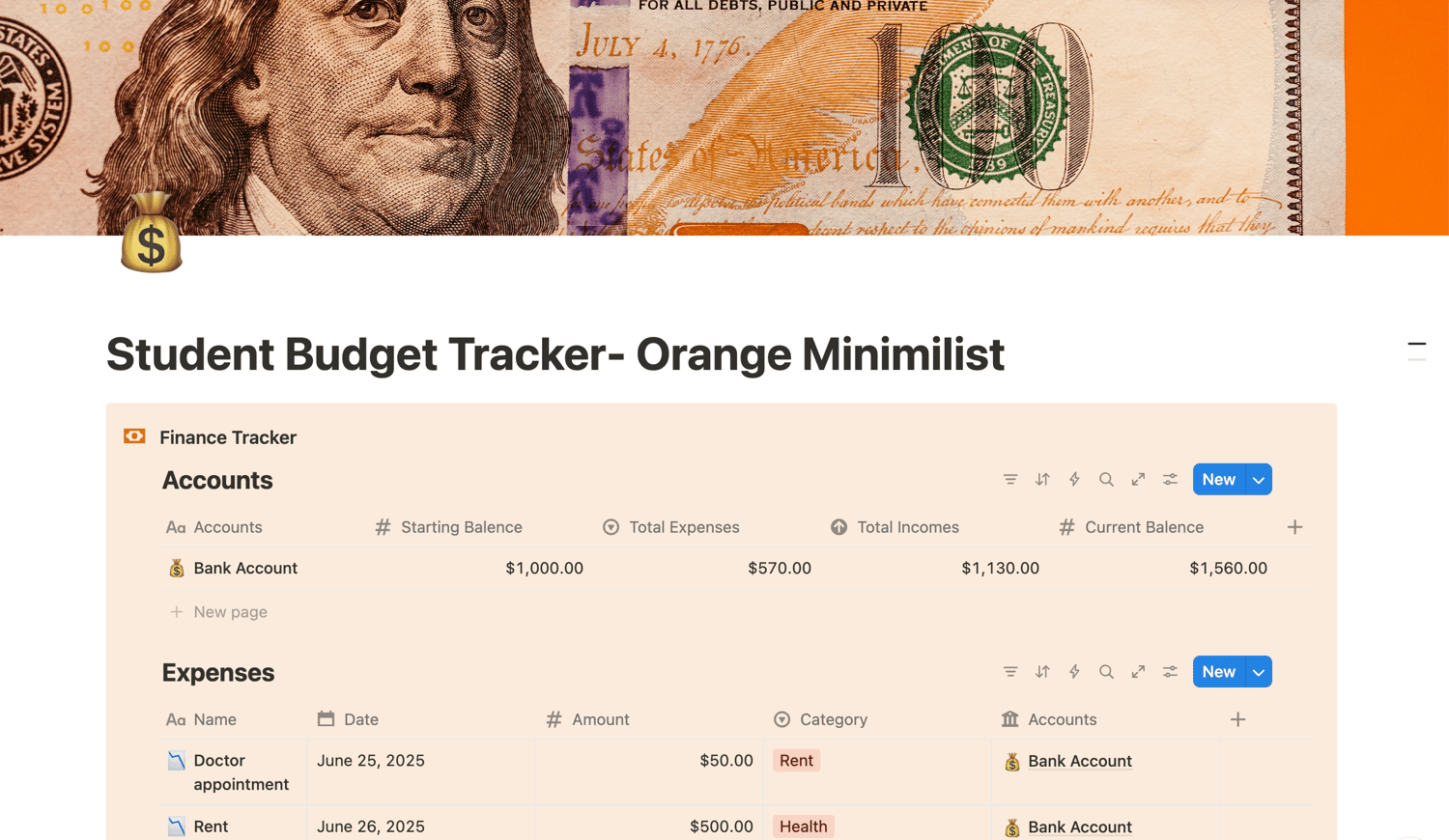 Built with a calming, minimalist Orange aesthetic, this template keeps your finances organised without the clutter. Ideal for students, casual workers, or anyone wanting a simple system to manage money in Notion.