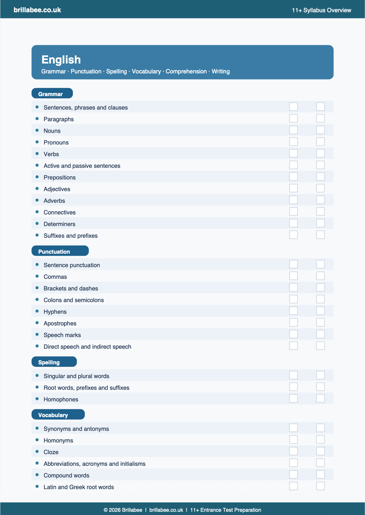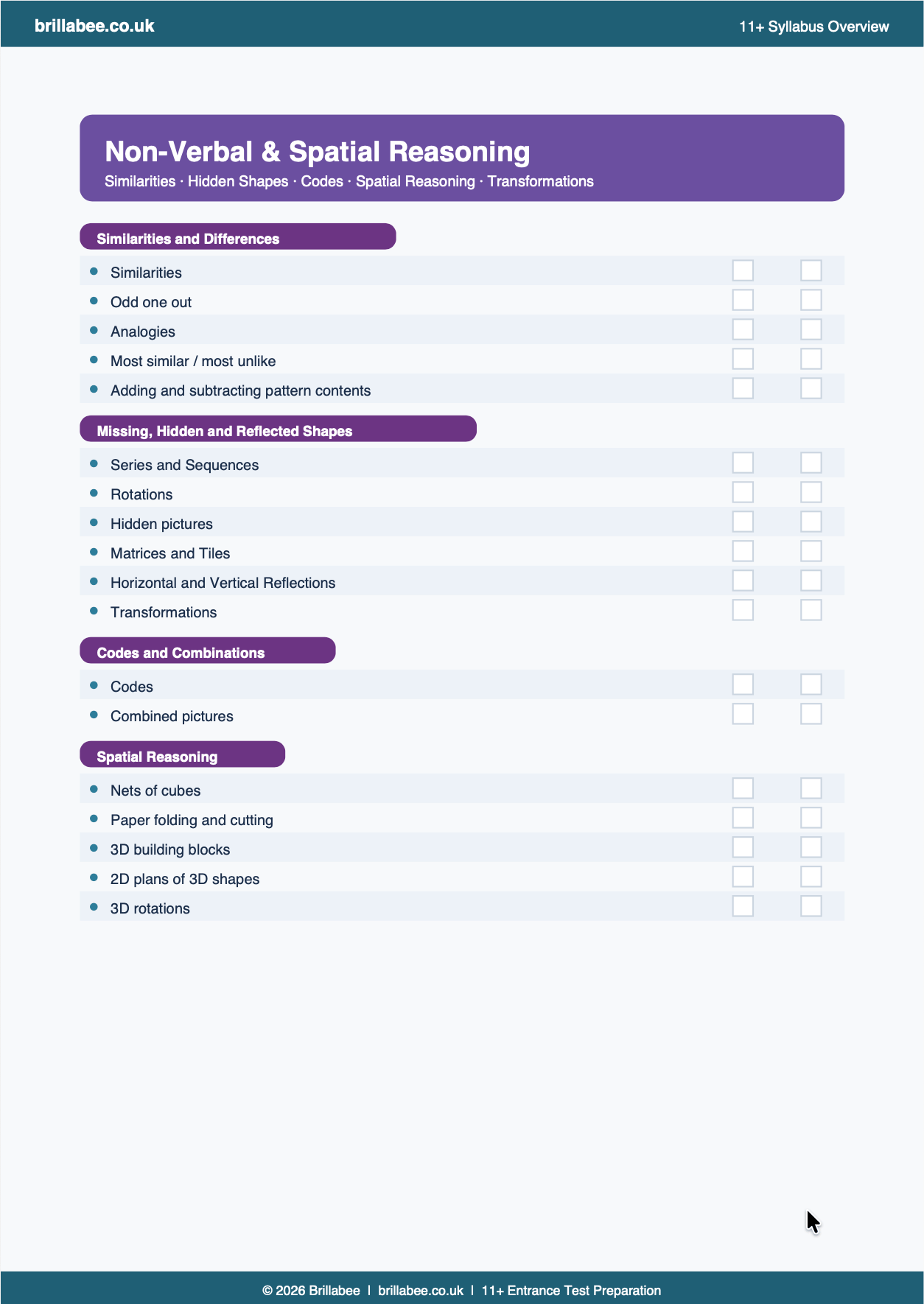 Everything your child needs to cover in one place. This topic-by-topic checklist spans all four 11+ subject areas: English, Maths, Verbal Reasoning, and Non-Verbal & Spatial Reasoning. Track progress from first introduction to exam-ready confidence, so nothing gets missed and nothing gets left to chance.
