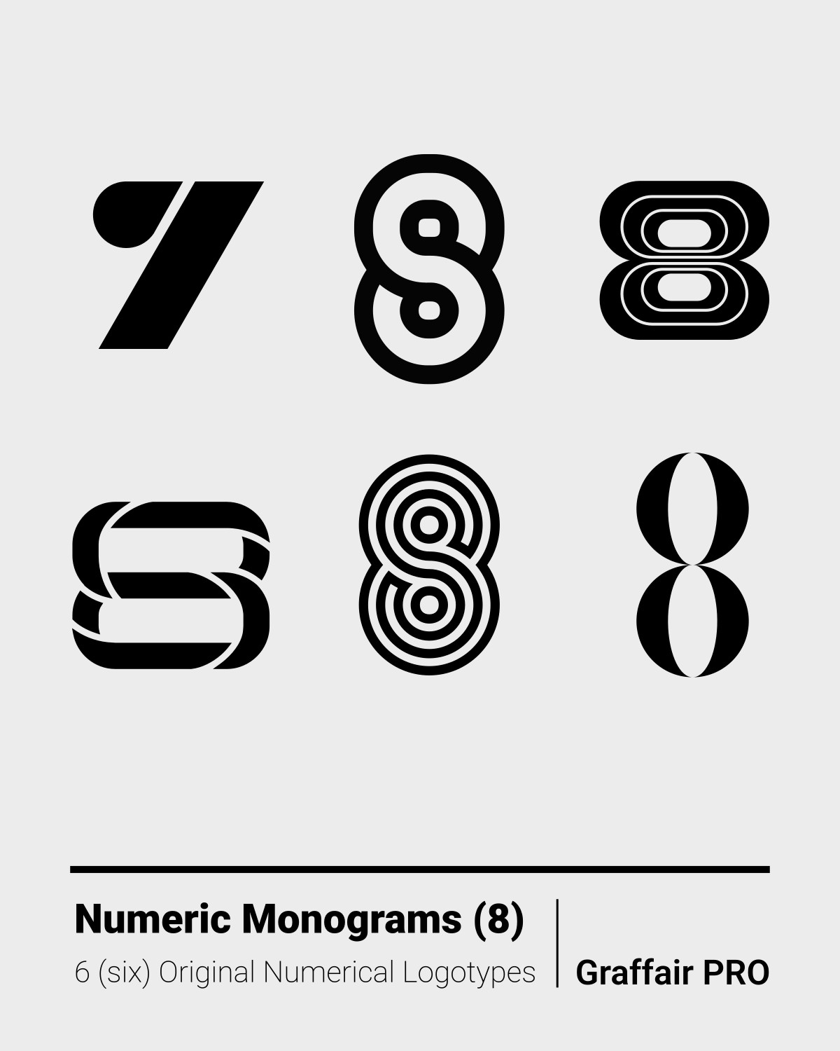 Numeric Monograms (8): The 8th set of six original numerical logo monograms, selected from a total of 47, included in the "1050 SVG Monograms" super package, which also features an Index catalog.