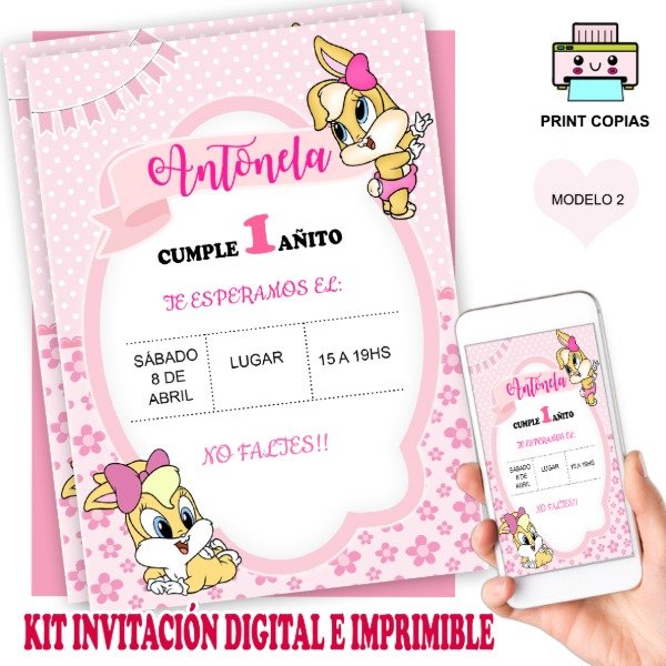 INVITACIÓN DIGITAL E IMPRIMIBLE LOONEY TUNES BEBÉS NIÑA (MODELO A ELECCIÓN)