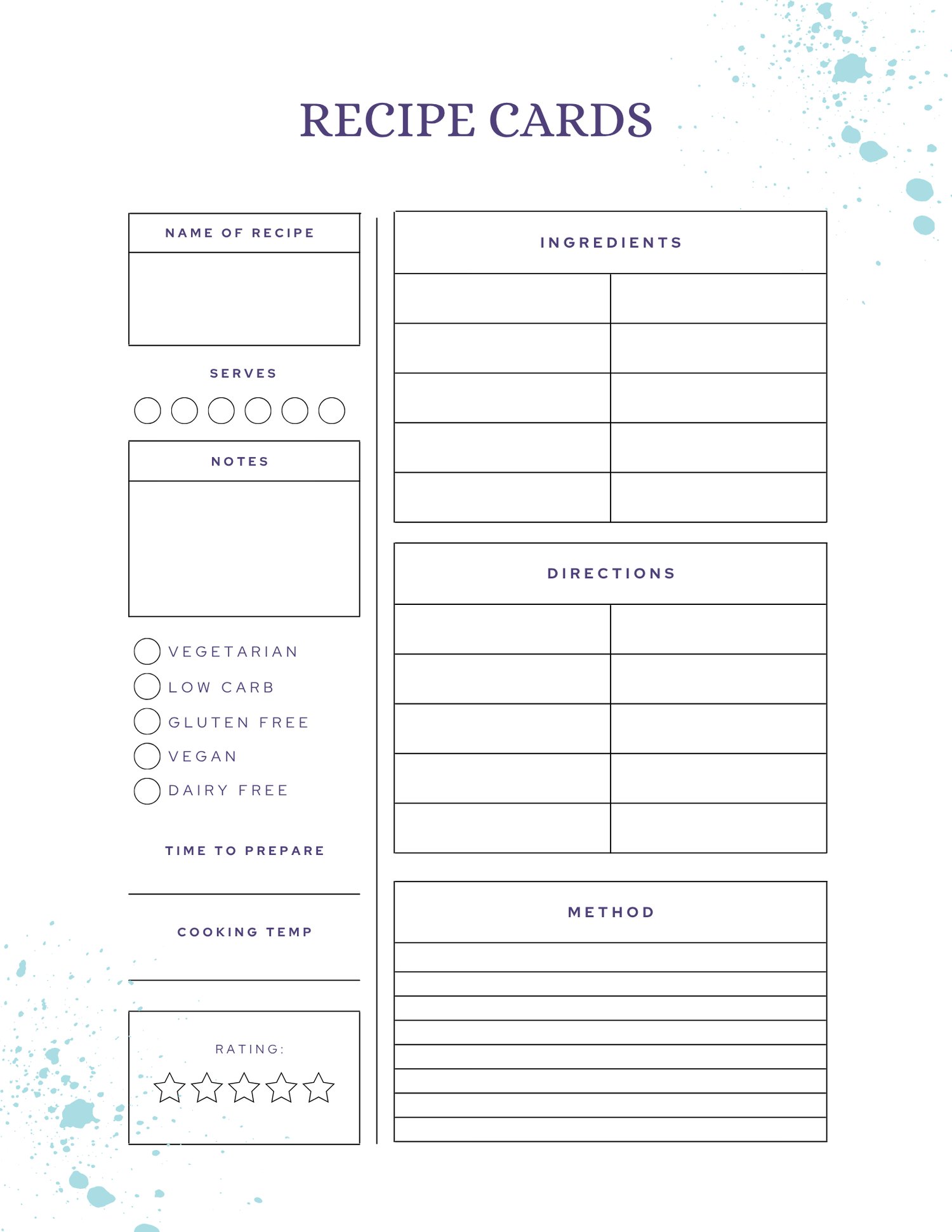 - Custom Recipe Cards: Fill in your own breakfast, lunch, dinner, sides, and snack favorites