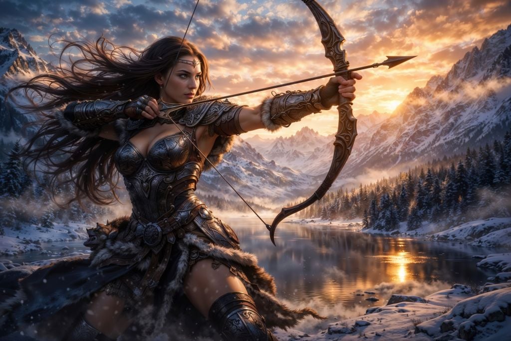 Bring cinematic fantasy to your space with Frostbound Huntress, a stunning 10K ultra-high-resolution artwork that looks like a frame pulled straight from an epic film. From the intricate engraved armor and wind-tossed hair to the glowing alpine sunset reflected on icy water, every detail is razor-sharp, richly textured, and built to wow—up close and across the room.