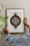 The vibrant primary colors—deep reds, blues, and sun-yellows—are contrasted by delicate line work, making it a perfect statement piece for a home office, meditation corner, or gallery wall.