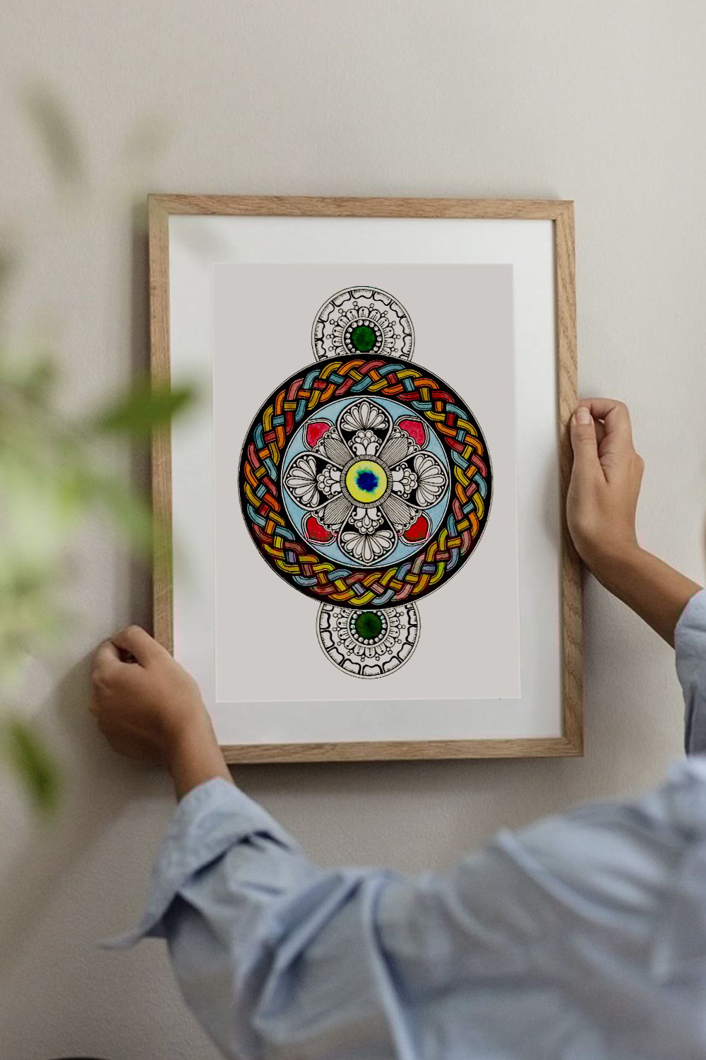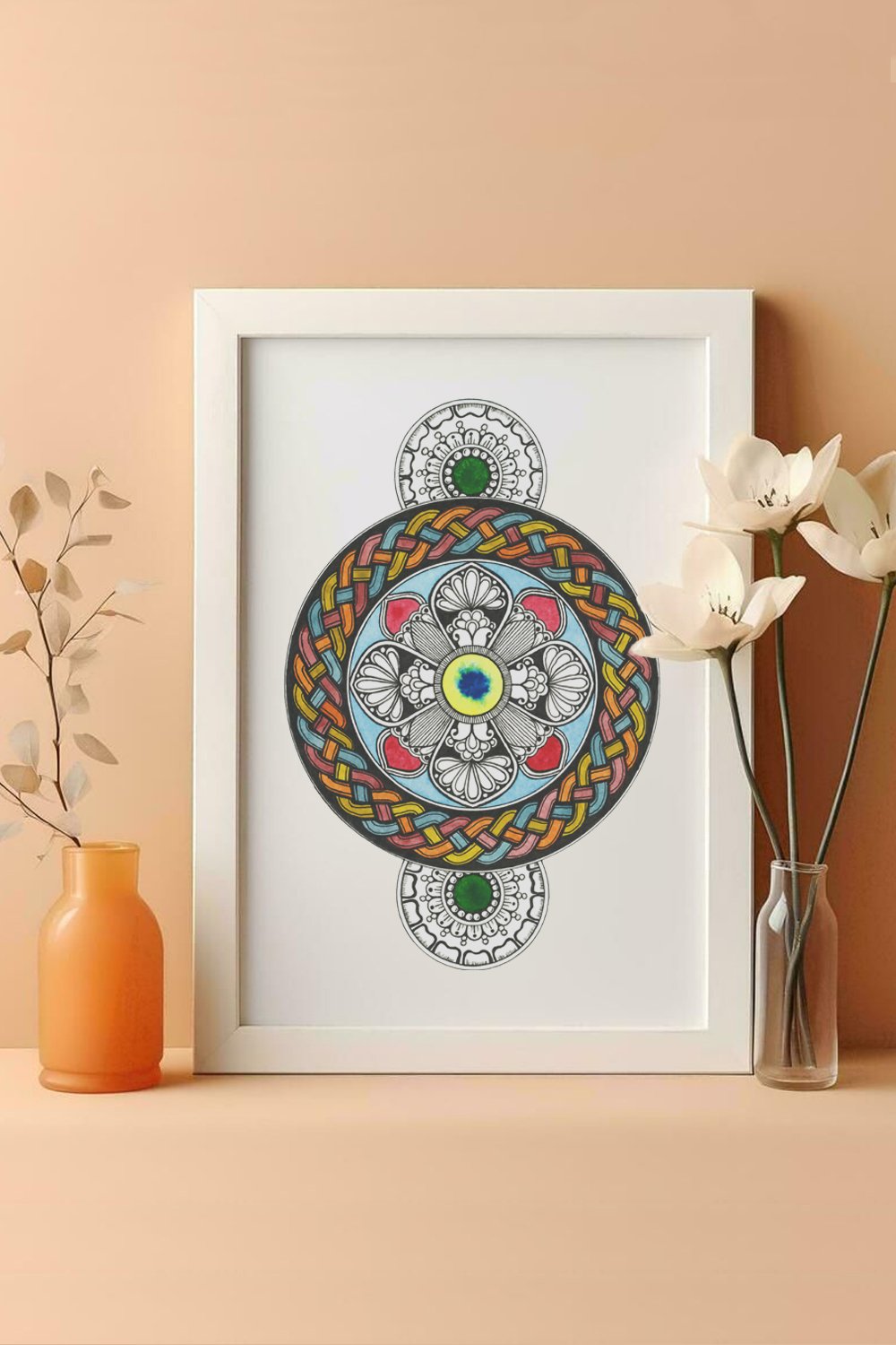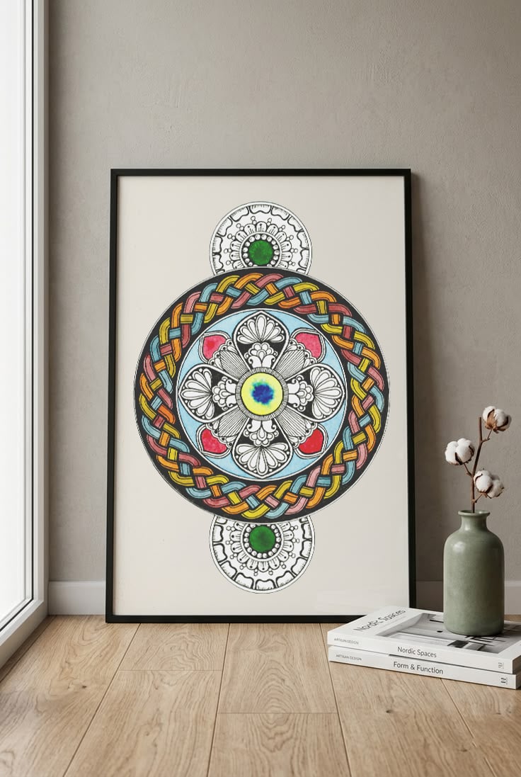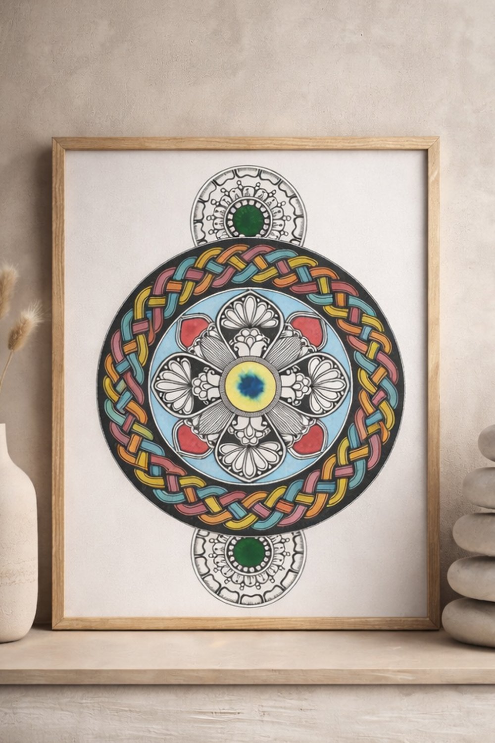 Bring a sense of balance and ancient artistry into your home with this unique Celtic Knot Mandala. Featuring a complex, hand-drawn braided border and a central floral motif, this piece combines the rich symbolism of the Celtic weave with the meditative focus of a traditional mandala.