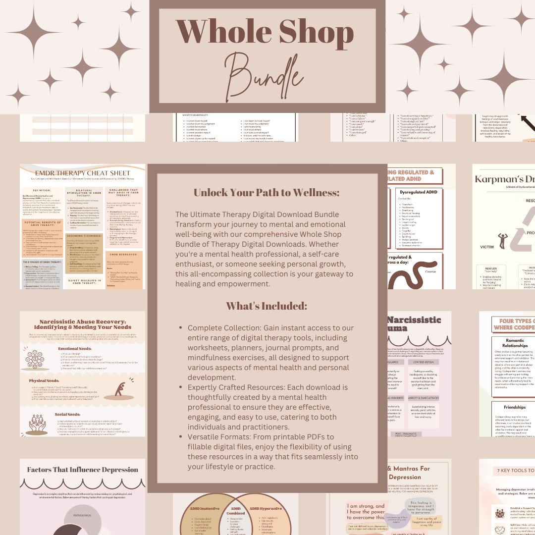 Unlock Your Path to Wellness: The Ultimate Therapy Digital Download Bundle Transform your journey to mental and emotional well-being with our comprehensive Whole Shop Bundle of Therapy Digital Downloads. Whether you're a mental health professional, a self-care enthusiast, or someone seeking personal growth, this all-encompassing collection is your gateway to healing and empowerment.