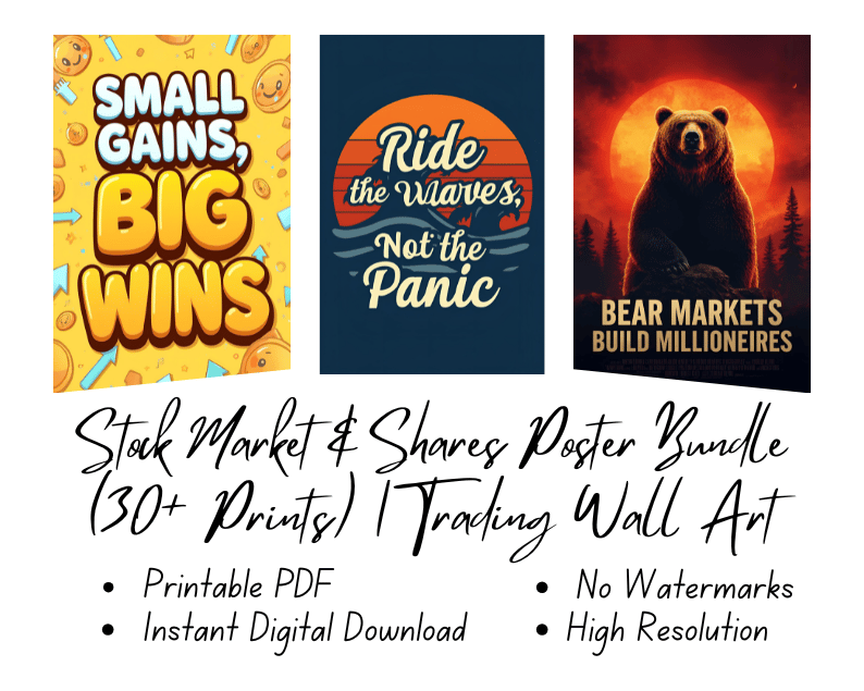 Designed with bold typography, modern finance visuals, candlestick charts, bull & bear symbols, and wealth-building quotes — this bundle turns your wall into a daily reminder to stay disciplined and focused on long-term success.