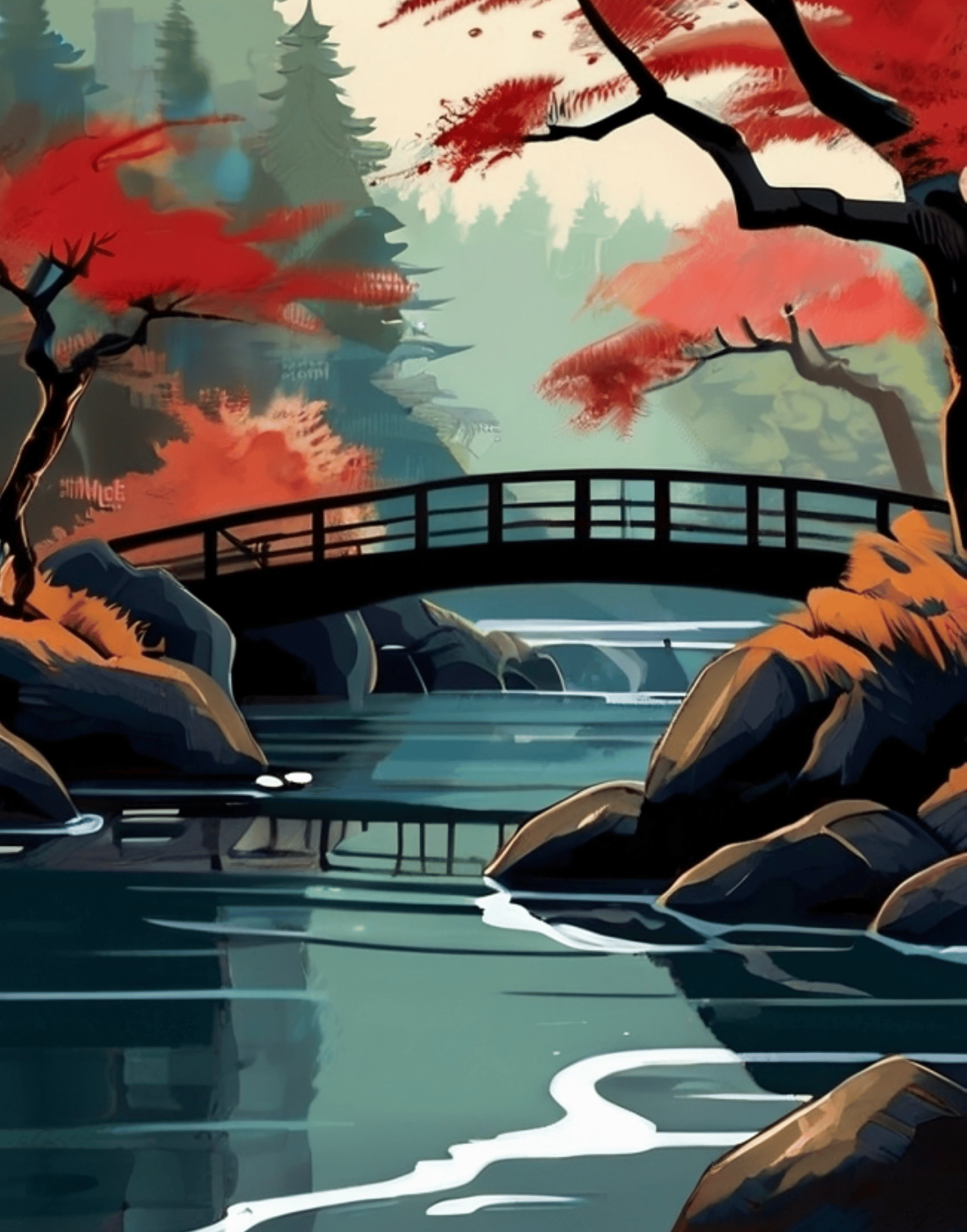 Japanese Painting, Japanese River, Vintage Village, Lake, Rocky Serene Place, Top Art, Nostalgic Rural life, Nature, Cool Nature, Beautiful Nature, Sunrise, Natural Landscape, Wall Art, Digital Art.