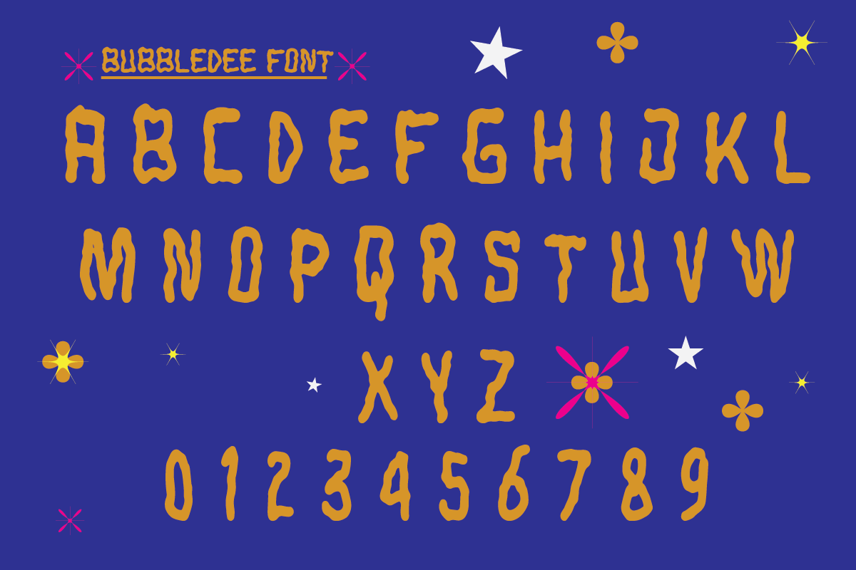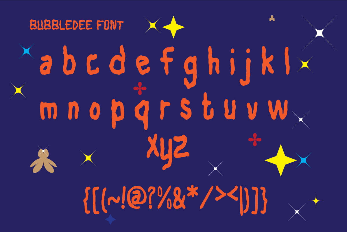 Introducing BubbleDee, the whimsical and playful font that dances across the page like bubbles in the wind. With its rounded edges and bubbly demeanor, BubbleDee brings a sense of joy and fun to any text it adorns. Perfect for children's books, playful posters, or any project aimed at capturing the imagination of young readers, this font embodies a sense of lightheartedness and creativity. Each letter floats and bounces, inviting kids to dive into the world of reading with enthusiasm. BubbleDee is not just a font; it's a gateway to a world of delightful storytelling and imagination.
