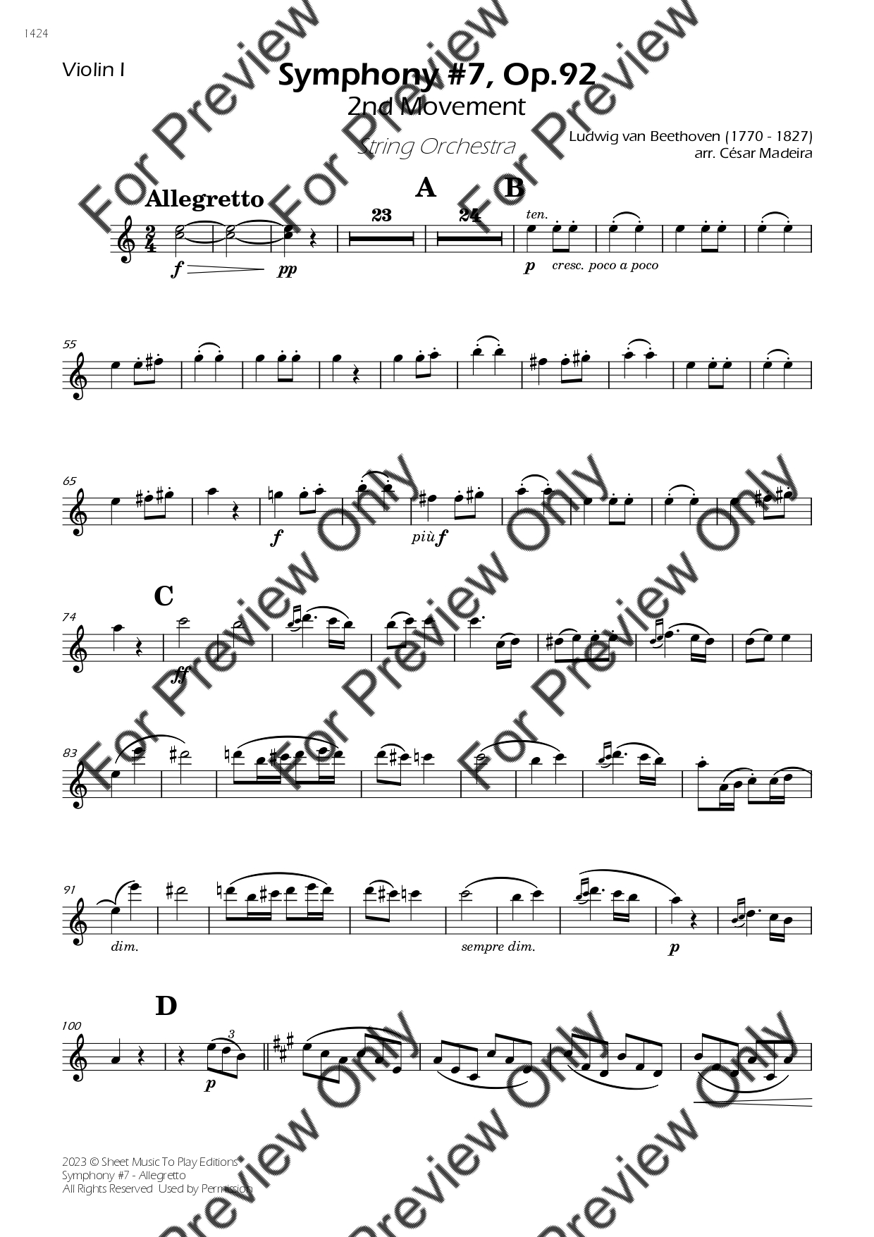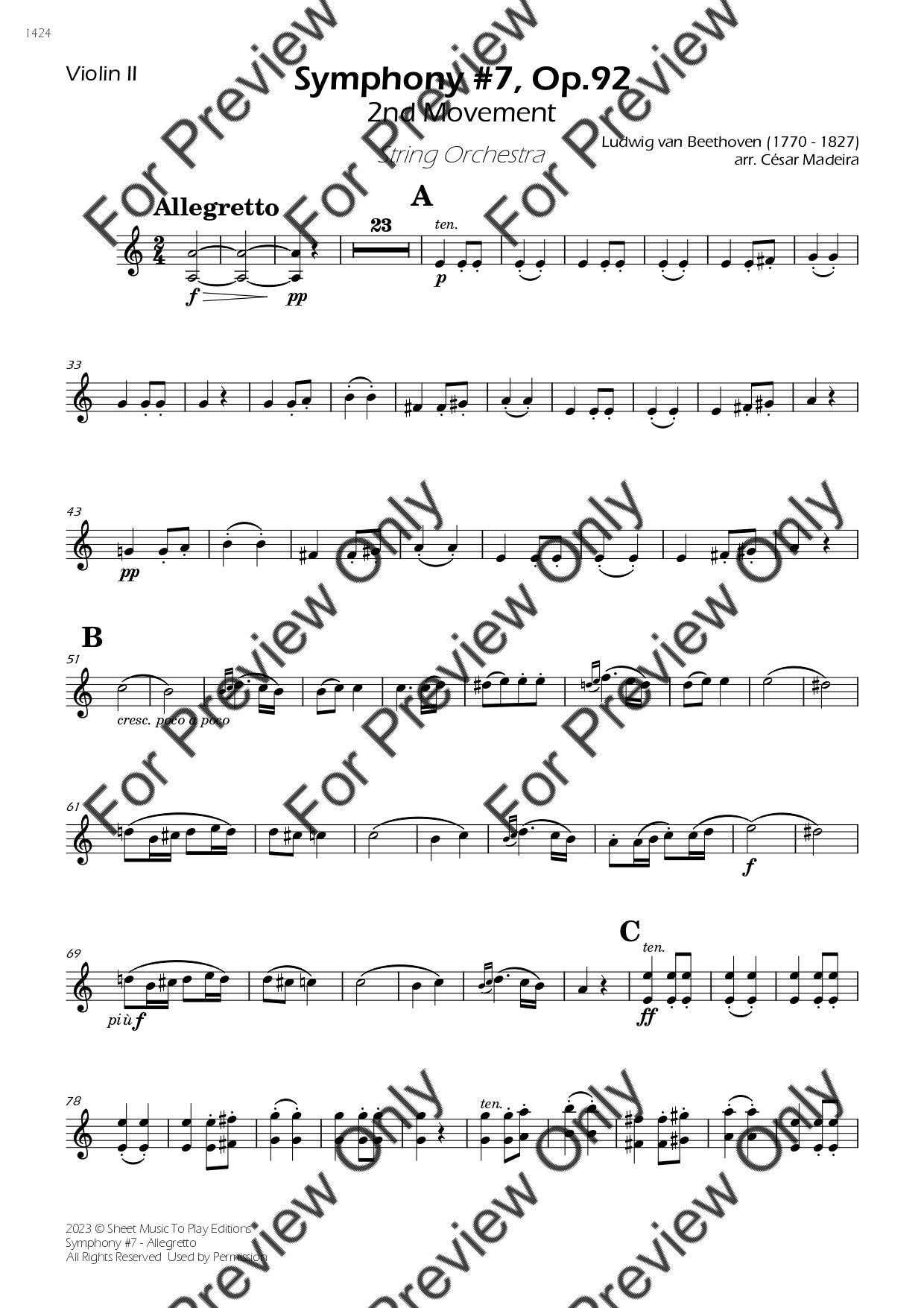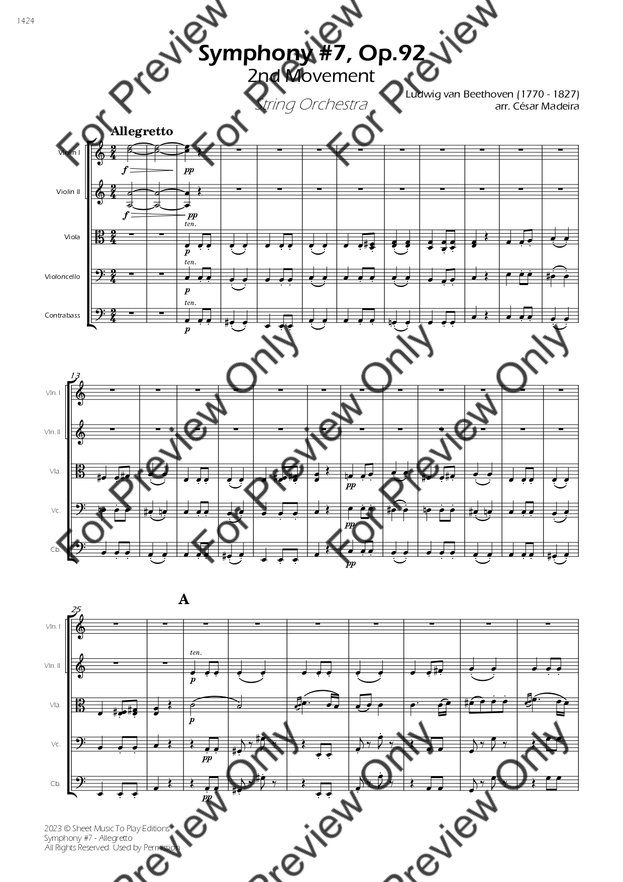 Symphony No.7 (2 mov. - Allegretto) by Ludwig Van Beethoven. Arrangement for String Orchestra - Violin 1, 2, Viola, Violoncello and Contrabass. With Full Score and Individual Parts. Have fun!