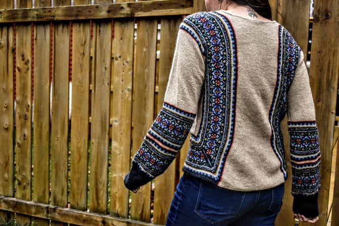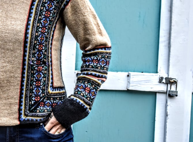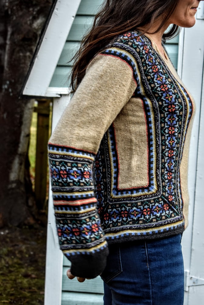 In 2015, the town of Rigolet in Northern Labrador completed the Seashore Boardwalk along their rugged and beautiful coastline. At 9 kilometres long, it is the world’s longest boardwalk. Extraordinary scenery in one of the most remote communities, the town is accessible only by airplane or seasonally by ferry. A boardwalk of stranded colourwork, mitered at the hem, encircles each side of the Rigolet sweater and tries to embody the majestic beauty of Rigolet’s boardwalk along its remote shoreline. The secret pocket in the Rigolet sweater is inspired by the archaeological dig site at the end of Rigolet’s boardwalk, in Double Mer Point, that holds mysteries of the past.