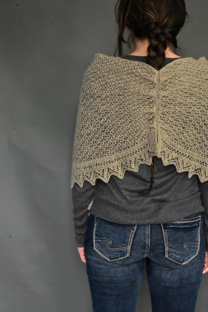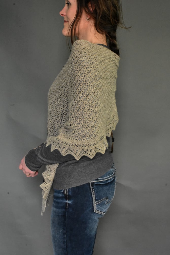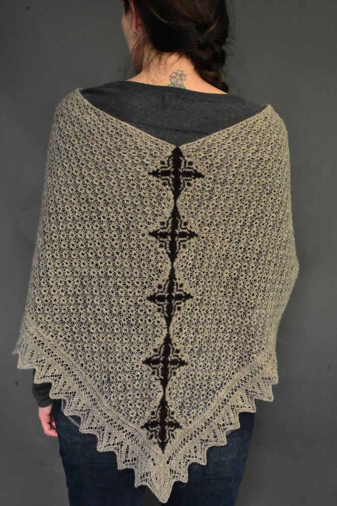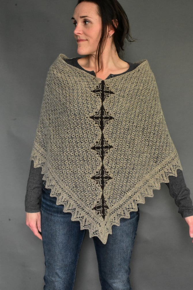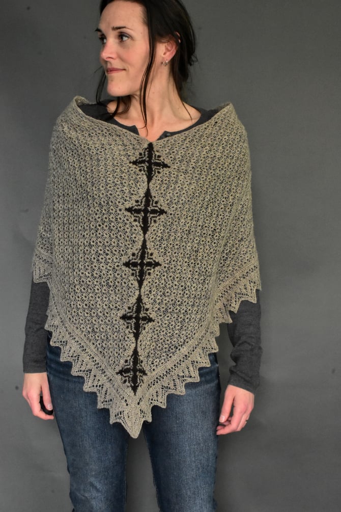 Mickeleens Path is a modular and closed hap, a sidekick to its older and bigger sister, the Bay Bulls cardigan. The Bird’s Eye lace body is worked separately in two pieces and then mitred stranded colourwork is worked flat to fill in the notches. A beautiful border finishes the body and showcases the Bird’s Eyes, then the two pieces are joined on both sides with a 3-needle BO to complete the closed hap. It is large enough to be worn as a cowl wrapped elegantly around your neck or open as a hap draped over your shoulders. A beautiful layer of warmth.