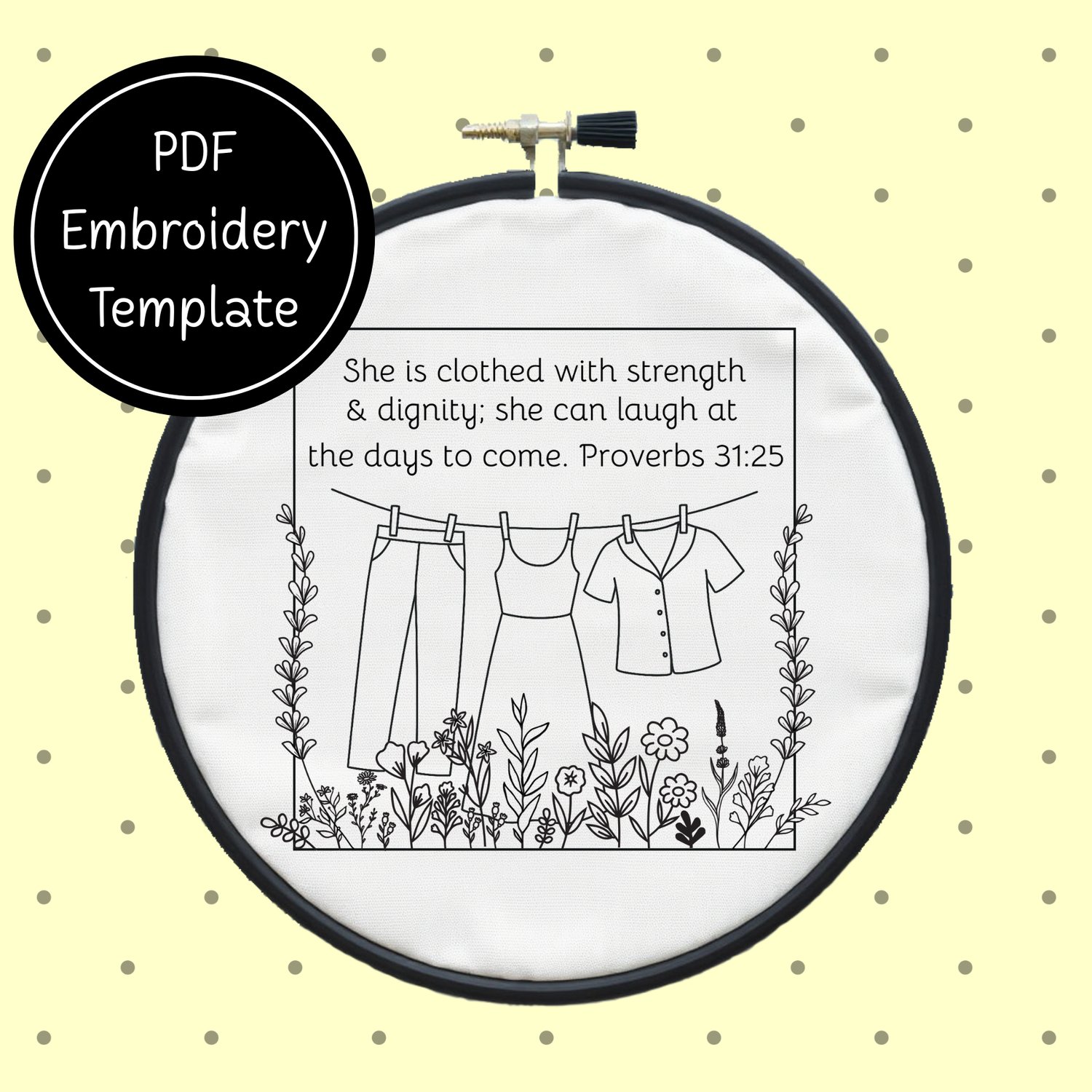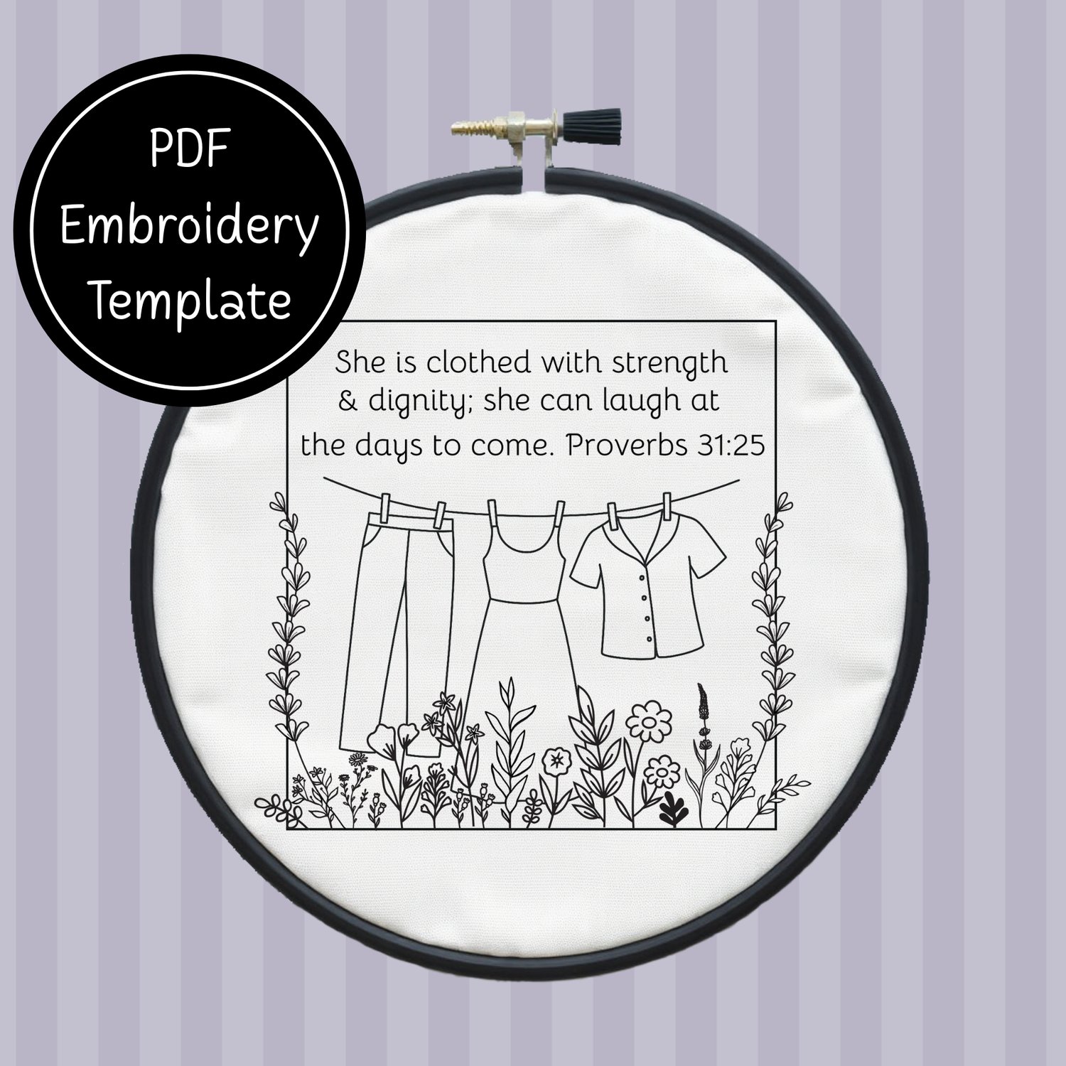 Make this Clothed in Strength, Christian Scripture Template from Proverbs 31:25 come alive with your choice of colors and stitches to create this simple embroidery template.