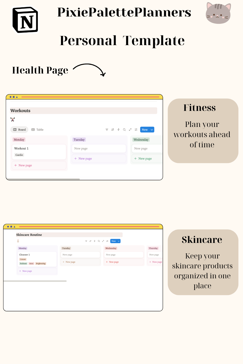 - Log workouts, track medications/supplements, and skincare routine in the Health Page