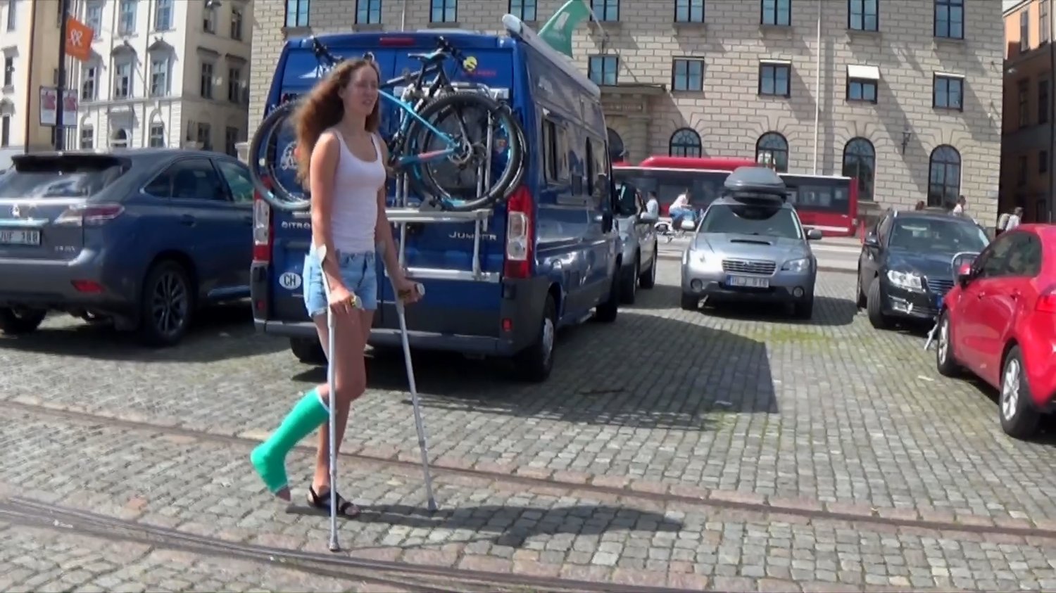 Tounghy is visiting Stockholm, Sweden and is today crutching around first at the wather and then over the bridgesShe has a top, shorts, a green short leg cast on her right leg and a sandal on her left foot.She is not afraid to crutch around in public and it looks like she like all attention she get.