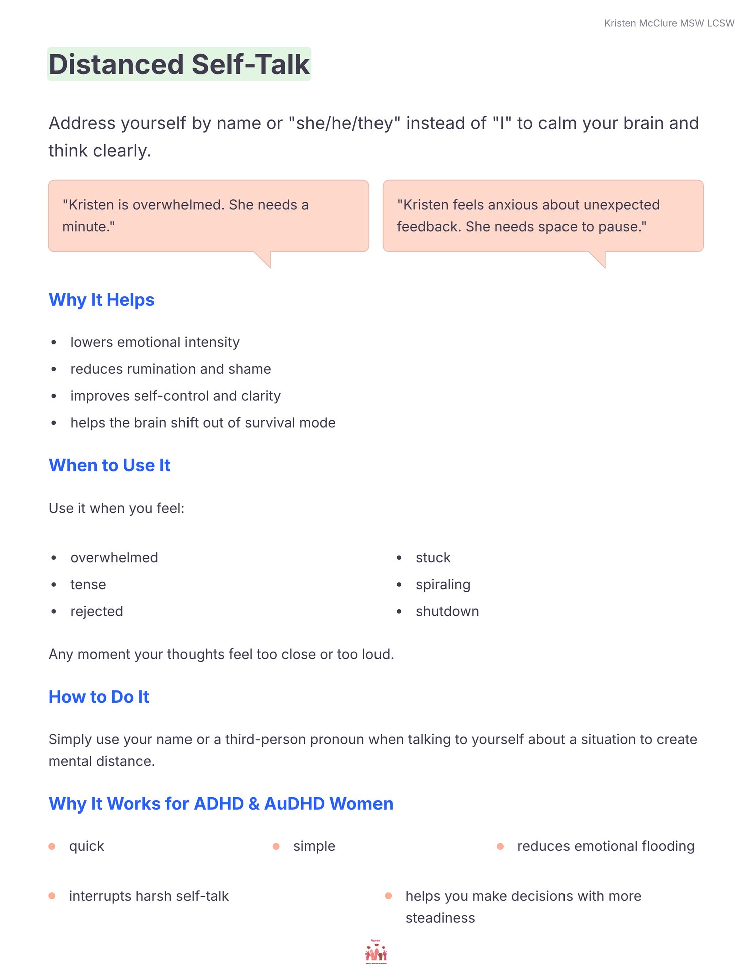 Distanced self-talk is a simple emotional regulation tool that helps ADHD and AuDHD women create space between a feeling and a reaction. Instead of saying “I feel overwhelmed,” you speak to yourself using your name or “she/they,” which immediately reduces emotional intensity and rumination. This shift helps the brain step out of survival mode and into clarity. This resource explains what distanced self-talk is, why it works, and how to use it in moments of overwhelm, shutdown, spiraling, or rejection sensitivity. It is written in clear, grounded language to support emotional steadiness and self-respect.