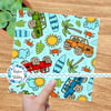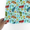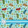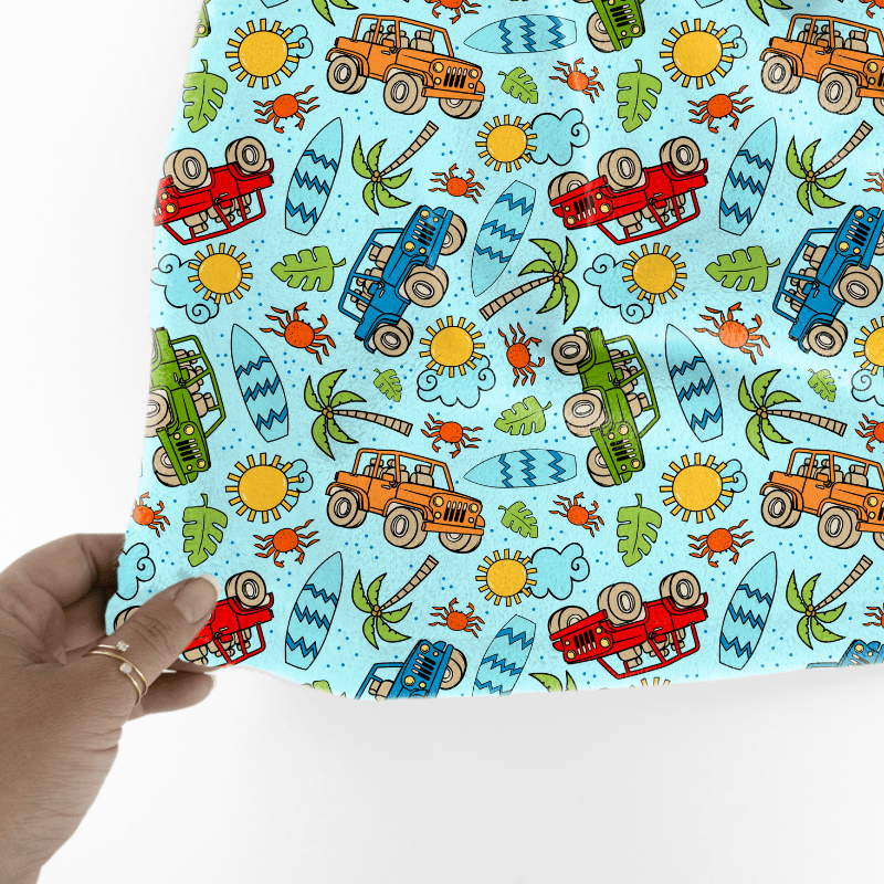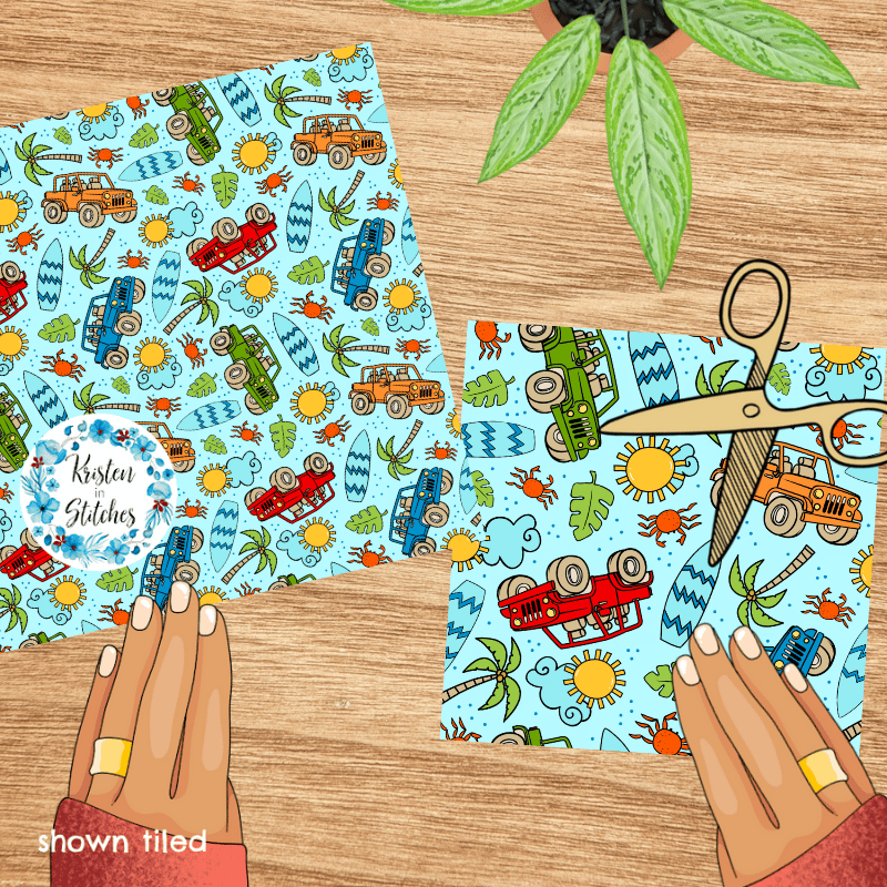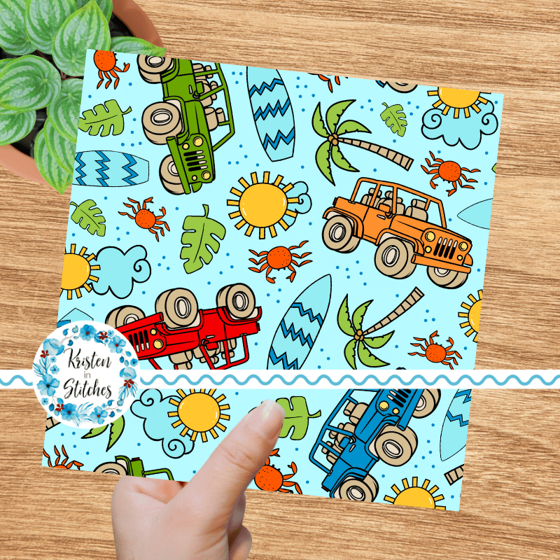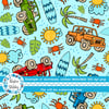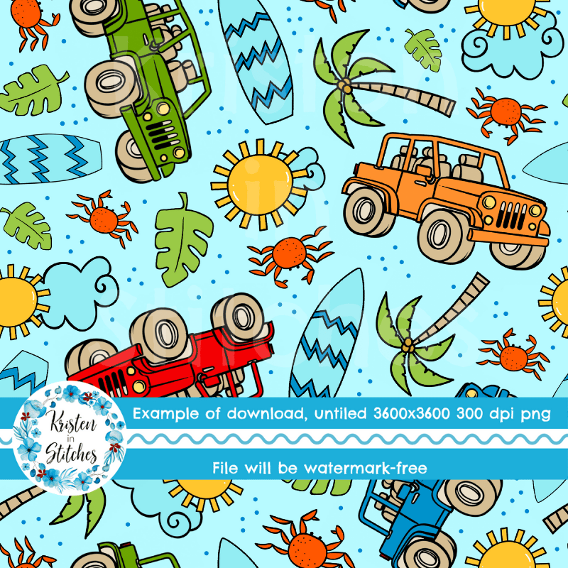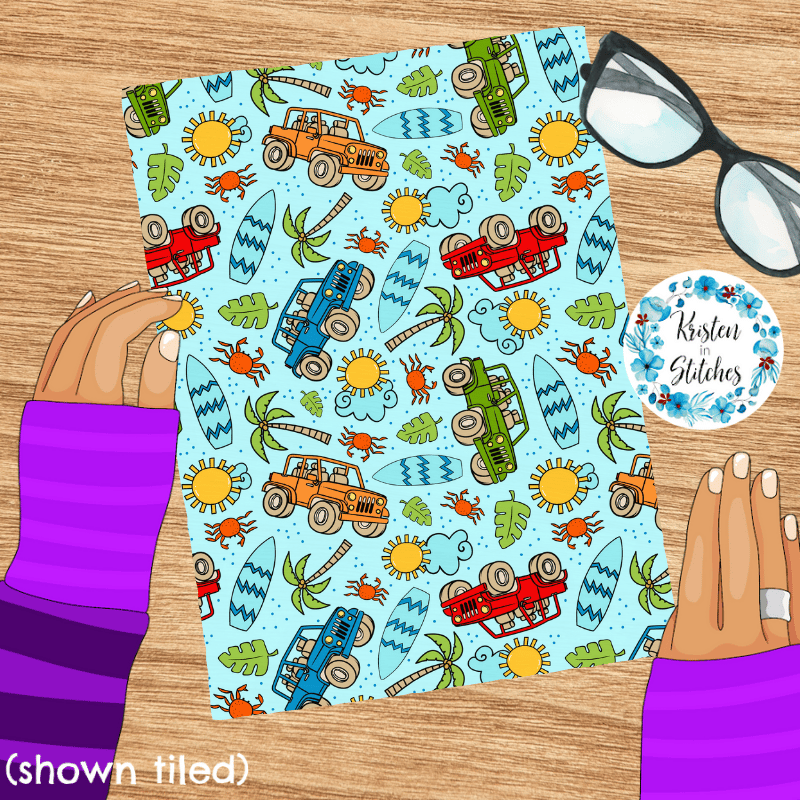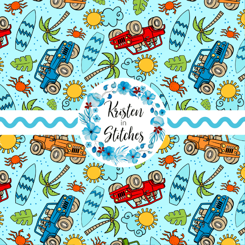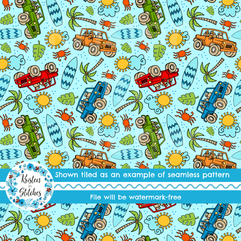 4x4 Jeep Tropical Summer Beach Vacation Adventures Seamless Pattern, Blue