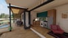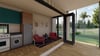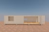This modern house plan is an architectural masterpiece designed using a 40-foot shipping container. The container is elevated off the ground on a pier foundation to create a modern container floor plan, one bedroom and one bathroom, and open plan living that opens onto a large covered front deck with outdoor lounging and a wood-fired bathtub perfect for entertaining.