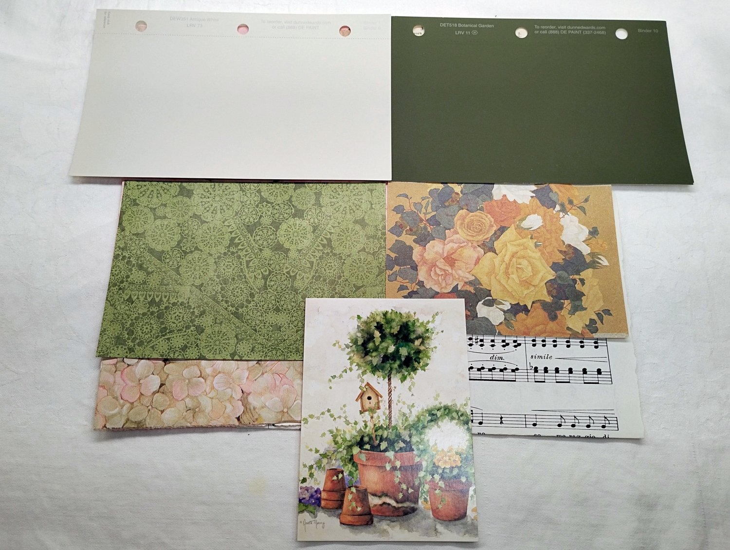 A small ephemera pack centered around a semi-sheer dusty light olive green beaded fabric. Included is wrapping paper, lace, scrapbook and decaupage papers, deconstructed jewelry, and other small pieces all color coordinated and ready to complement a bigger project.