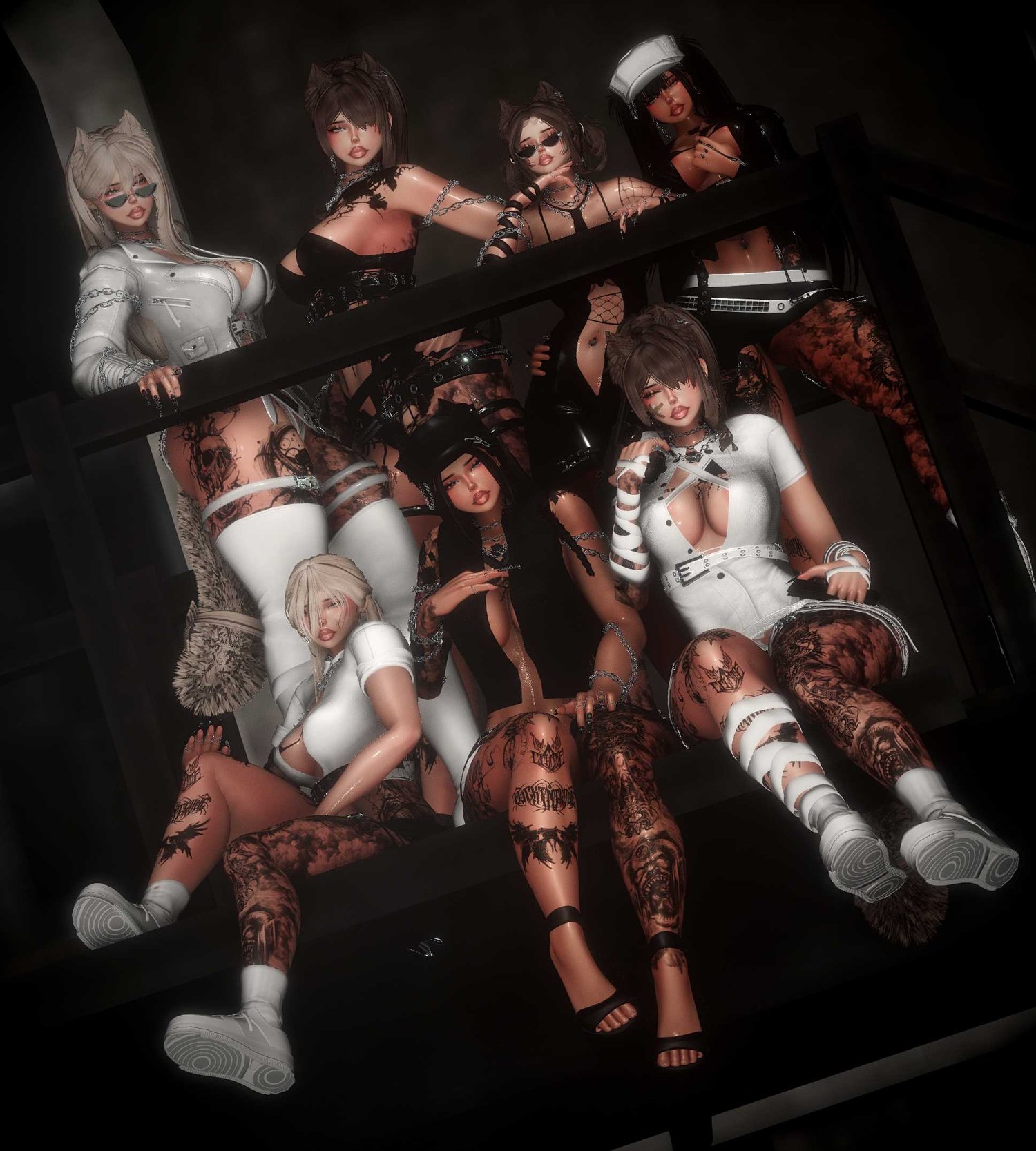 Abel, Braids, Clipped Hair, Kohana, Lilly, Nanami, Pepper, Bald :3, Arm chain L, Arm chain R, Arm Straps, Arm Wraps, Face Bandage, Belts, Hat, Thigh Buckles, Leg Wrap, Necklace 1, Necklace 2, Rings, Tie, Glasses, Piercings, Gun, Corset Top, Button Up, Undershirt, Fishnet Top, Leather Jacket, Bikini, Puffer Vest, Latex Bodysuit, Bandage Bodysuit, Shorts, Skirt, Jeans, Thong, Harness Panties, Leather Heels, Combat Heels, Nes10, YV Heels