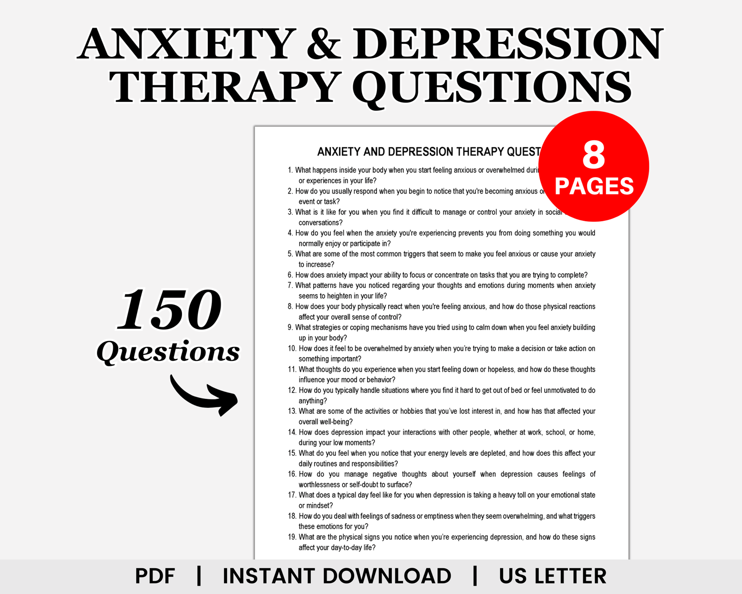 Designed to enhance client engagement and drive positive change, this therapy resource offers a collection of anxiety and depression therapy questions. Tailored to the principles of anxiety and depression disorders, these therapy questions will guide your sessions towards productive conversations and transformative outcomes. These anxiety and depression questions are made to elicit insightful responses and encourage clients to explore their goals and aspirations.
