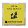 Printed with an image of an electric mobility scooter and the message 'Your new vehicle has arrived - happy birthday grandad' this card is certain to make anyone smile.