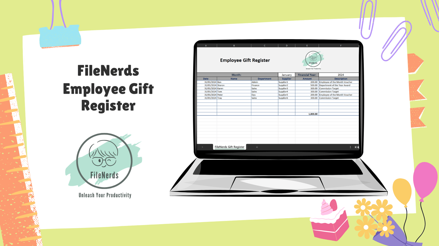 FileNerds employee gift register template makes rewarding your staff simple and seamless. With our easy to use spreadsheet, you can keep track of employee gifts and milestones.