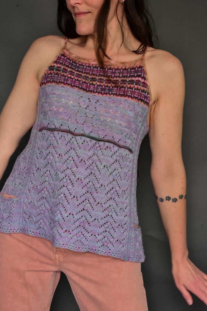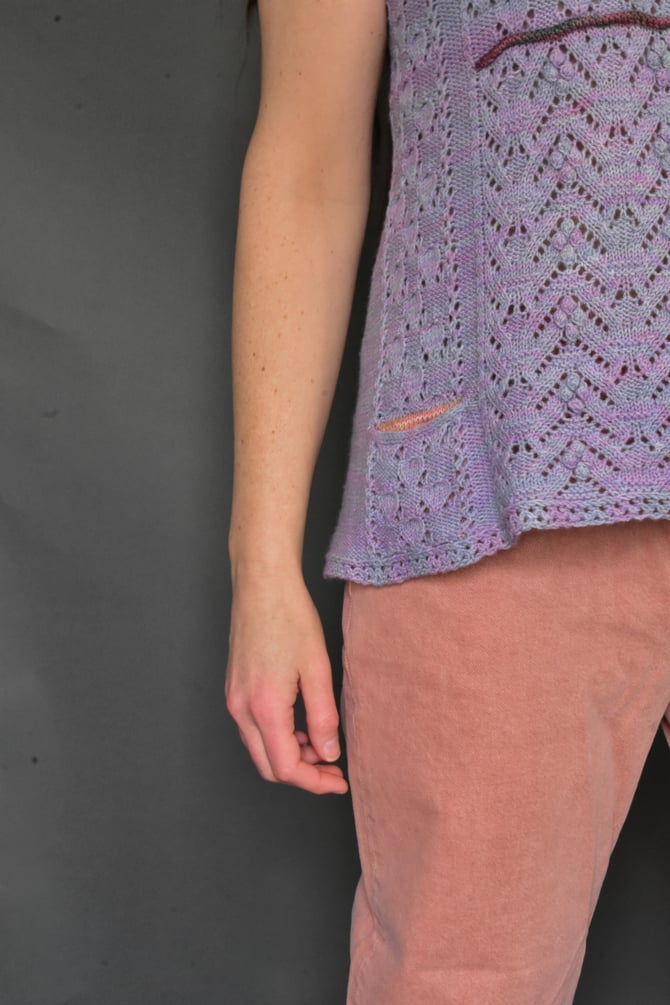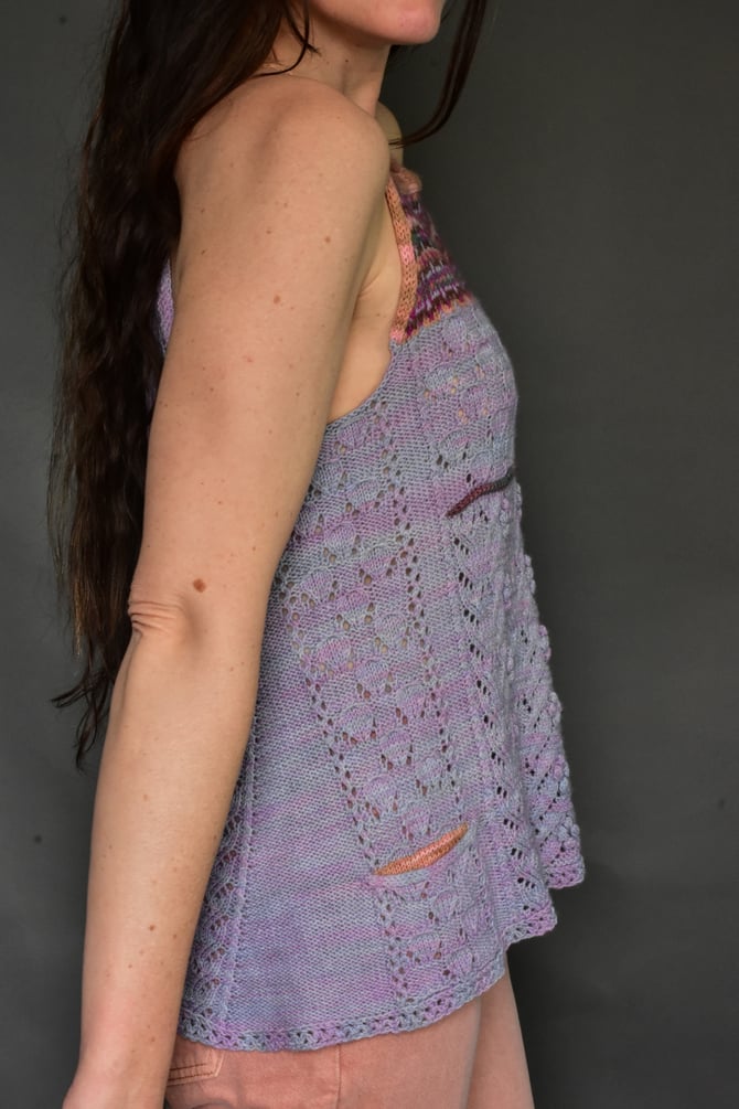 Pouch Cove ~ pronounced “pooch” cove ~ is a fun camisole full of detail by blending textures, colours, and techniques. There are cables, lace, bobbles, Fair Isle, and even welts. It’s knit top down, with welts and overlapping fabric in the back to highlight the transition between the lace patterning. Increases are worked along the back edge of each side, giving a bias fabric at the sides that results in a flattering drape and shape. Wear under a blazer, a cardigan, or on its own whilst beachcombing for little marine treasures!