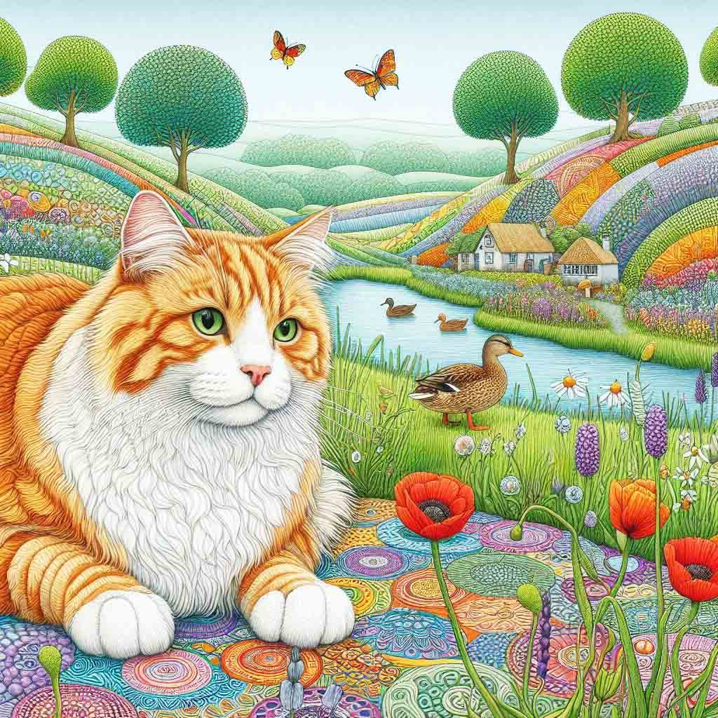 Ginger & white cat on patterned ground with trees & flowers, a pond ducks & butterflies.