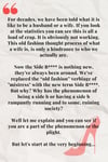 For decades, we have been told what it is like to be a husband or a wife. If you look at the statistics you can see this is all a load of crap. It is obviously not working. This old fashion thought process of what a wife is, is only a hindrance to who we actually are.