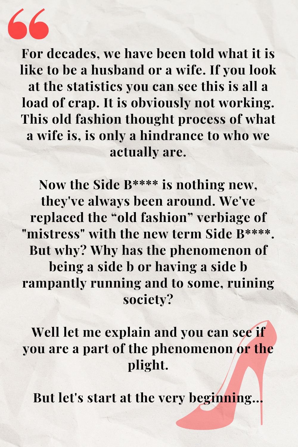 Now the Side Chick is nothing new, they've always been around. We've replaced the “old fashion” verbiage of "mistress" with the new term Side Chick. But why? Why has the phenomenon of being a side chick or having a side chick rampantly running and to some, ruining society?