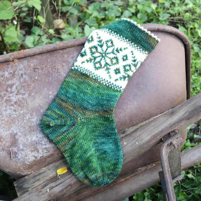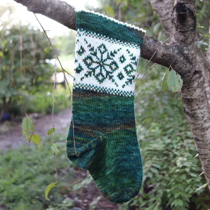 The stocking is knit top-down with a turned hem above a stranded-colorwork border. A forethought wedge heel and star toe complete the piece. Knit in DK weight hand-dyed yarn, it makes a perfect heirloom for passing down to future decorating generations.