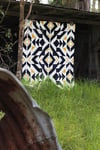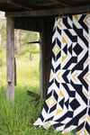 Inspired by a combination of Aztec and graphic styles this quilt pattern will allow you to take the pressure off choosing fabrics by keeping it simple. With a striking dark fabric you can create a visual effect that forces your eye to follow the structured and dramatic lines down the centre of the quilt. Highlighted with a medium tone and contrasted sharply with white this quilt is striking to look at.