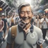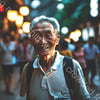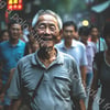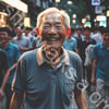 A high resolution realistic hyper-detailed daylight photo of a smile elderly man wearing a polo shirt walking a crowded footpath in Guangzhou, his face illuminated by the flash light of his phone that he is looking