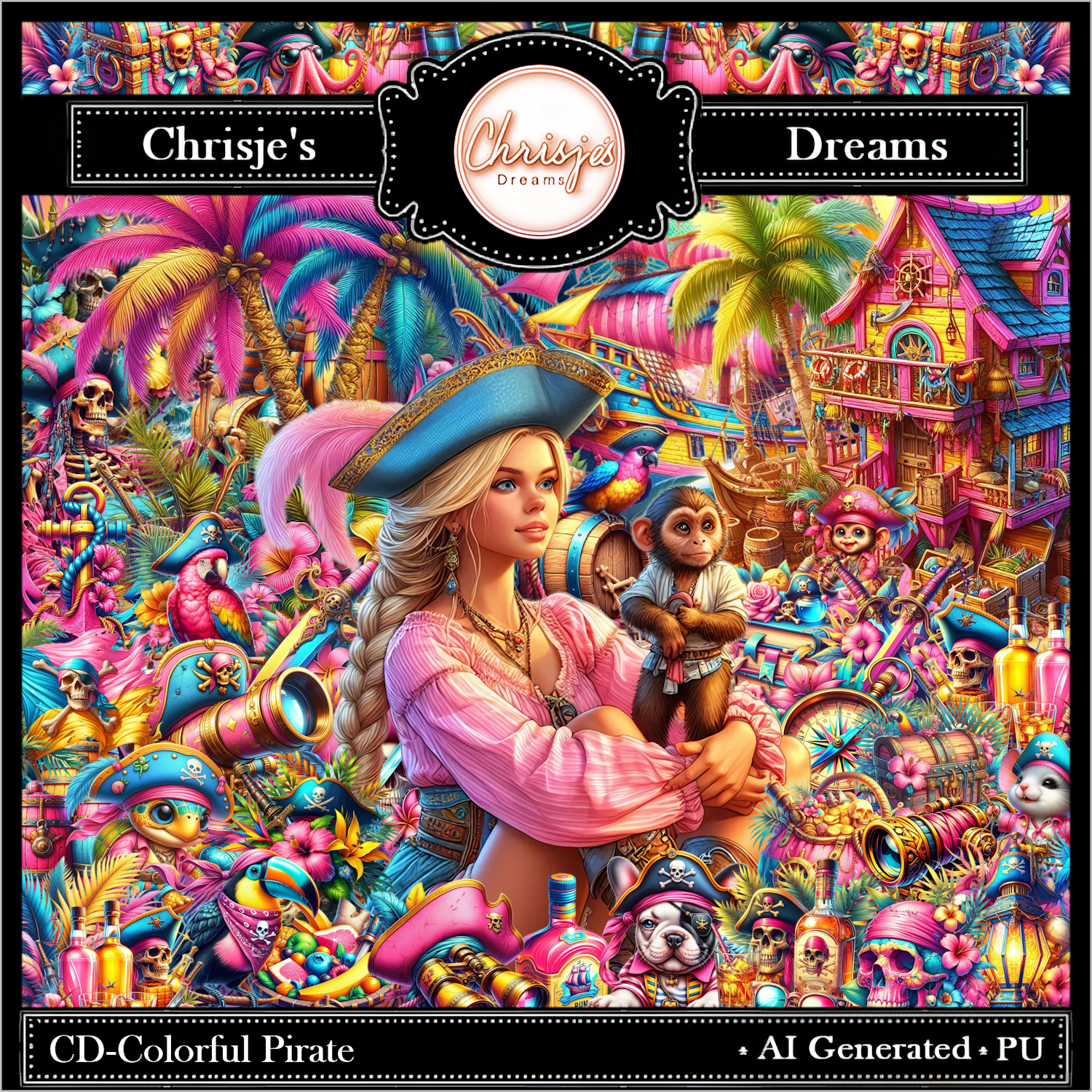 Colorful Pirate is a 🐒🌴Pirate🌴🐒 themed kit which contains 122 elements, 12 papers and 2 beautiful AI generated png tubes by Chrisje's Dreams.