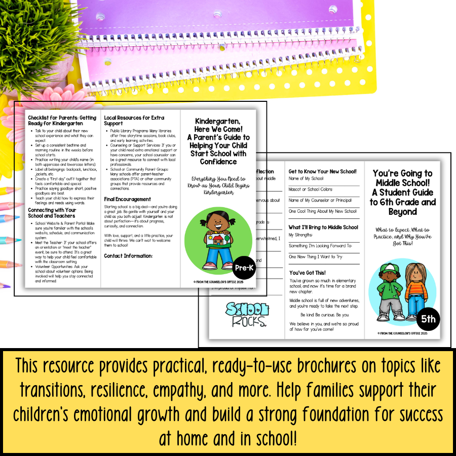 These brochures are not only visually appealing but also packed with practical, real-world strategies that are easy to implement right away. Whether you're a school counselor, teacher, or parent, you'll appreciate the convenience and effectiveness of this well-rounded bundle. Designed with accessibility in mind, these handouts provide invaluable support for children’s social-emotional growth and learning at every stage.