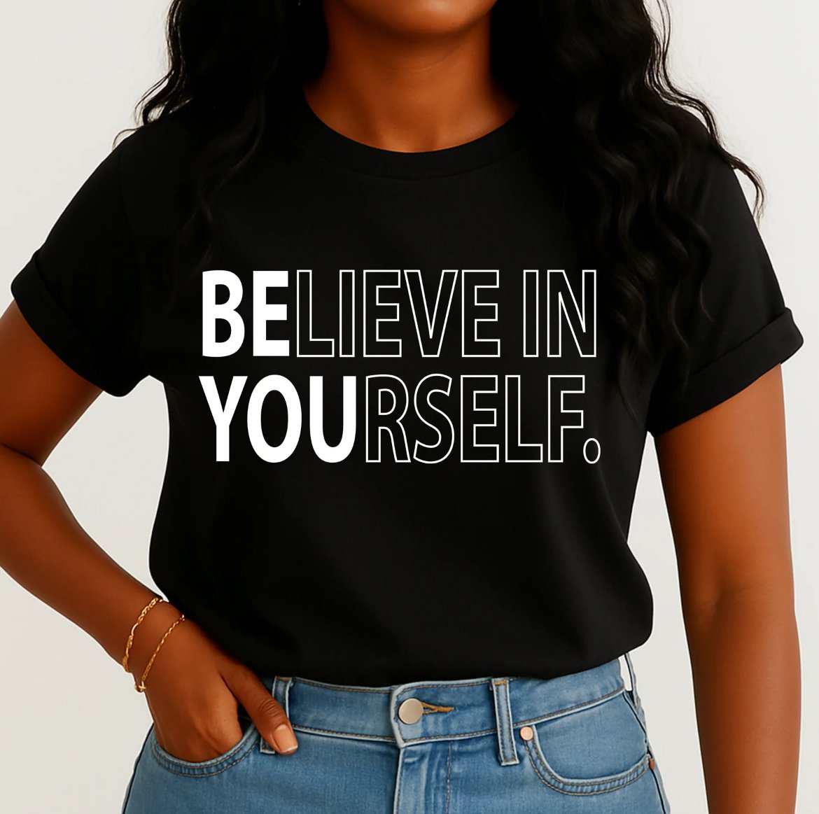 Motivate and inspire with this bold “BELIEVE IN YOURSELF” screen print a perfect reminder to stay confident and chase your dreams. The clever text design highlights “BE YOU,” making it not just stylish but empowering too! Printed in crisp white on a classic black background, this design pairs beautifully with any color tee.