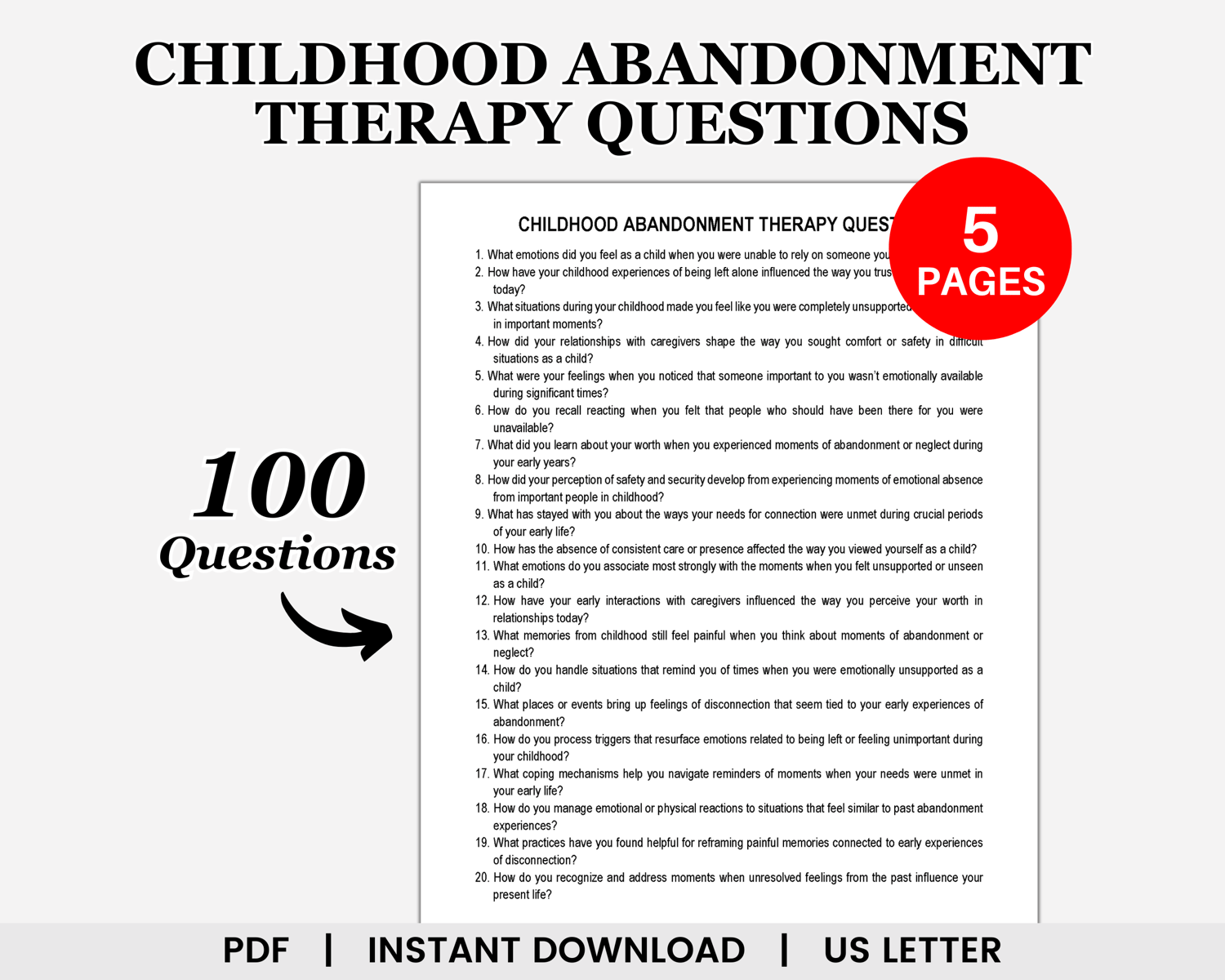 Designed to enhance client engagement and drive positive change, this therapy resource offers a collection of childhood abandonment therapy questions. Tailored to the principles of childhood emotional neglect, these therapy questions will guide your sessions towards productive conversations and transformative outcomes. These childhood abandonment therapy questions are made to elicit insightful responses and encourage clients to explore their goals and aspirations.