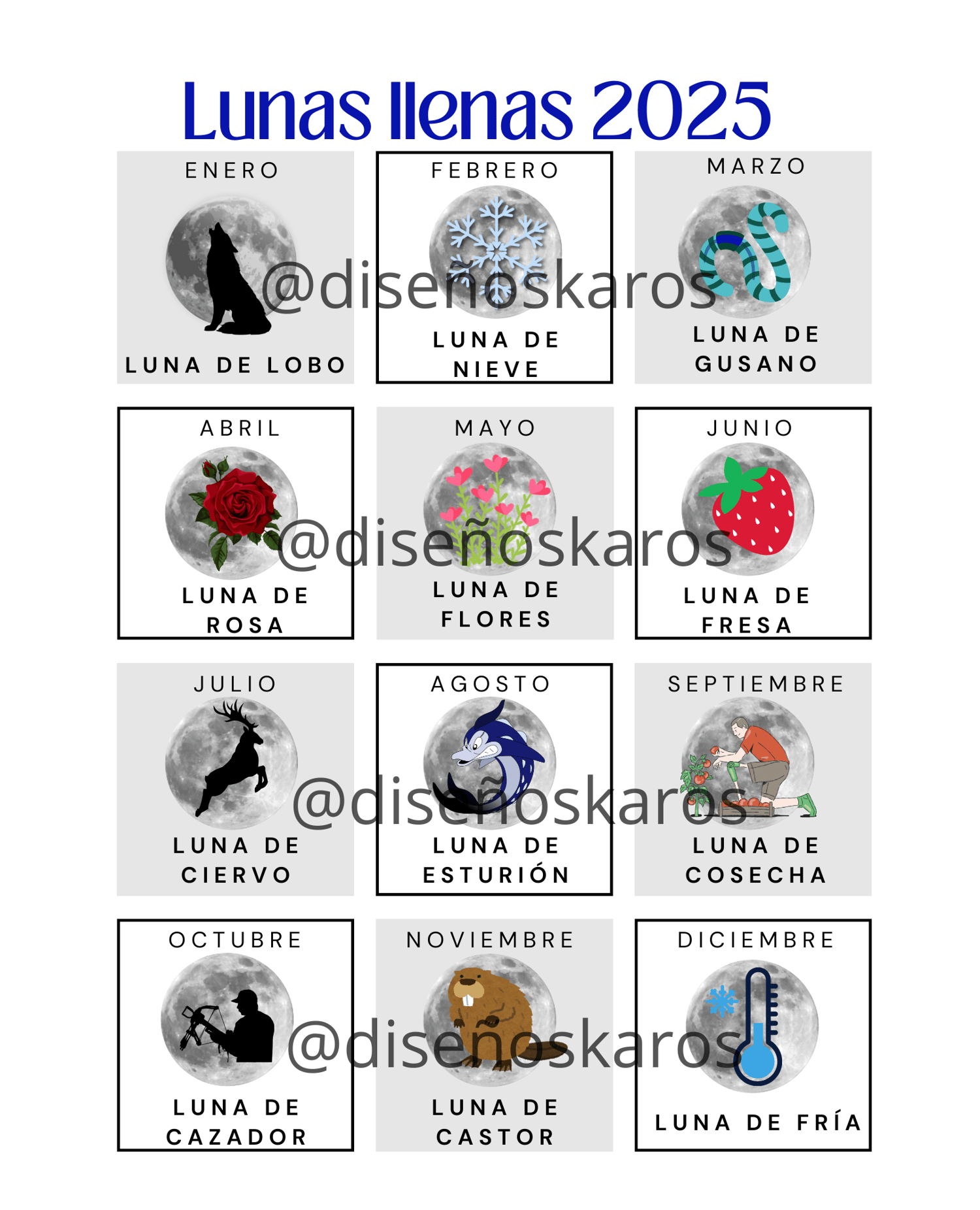 - Fases lunares detalladas: cada mes incluye las fases lunares (luna nueva, creciente, llena y menguante) y las 12 lunas llenas especiales: Luna del Lobo, de Nieve, de Gusano, rosa, de Flores, de Fresa, del Ciervo, del Esturión, de la Cosecha, del Cazador, del Castor y Luna Fría.