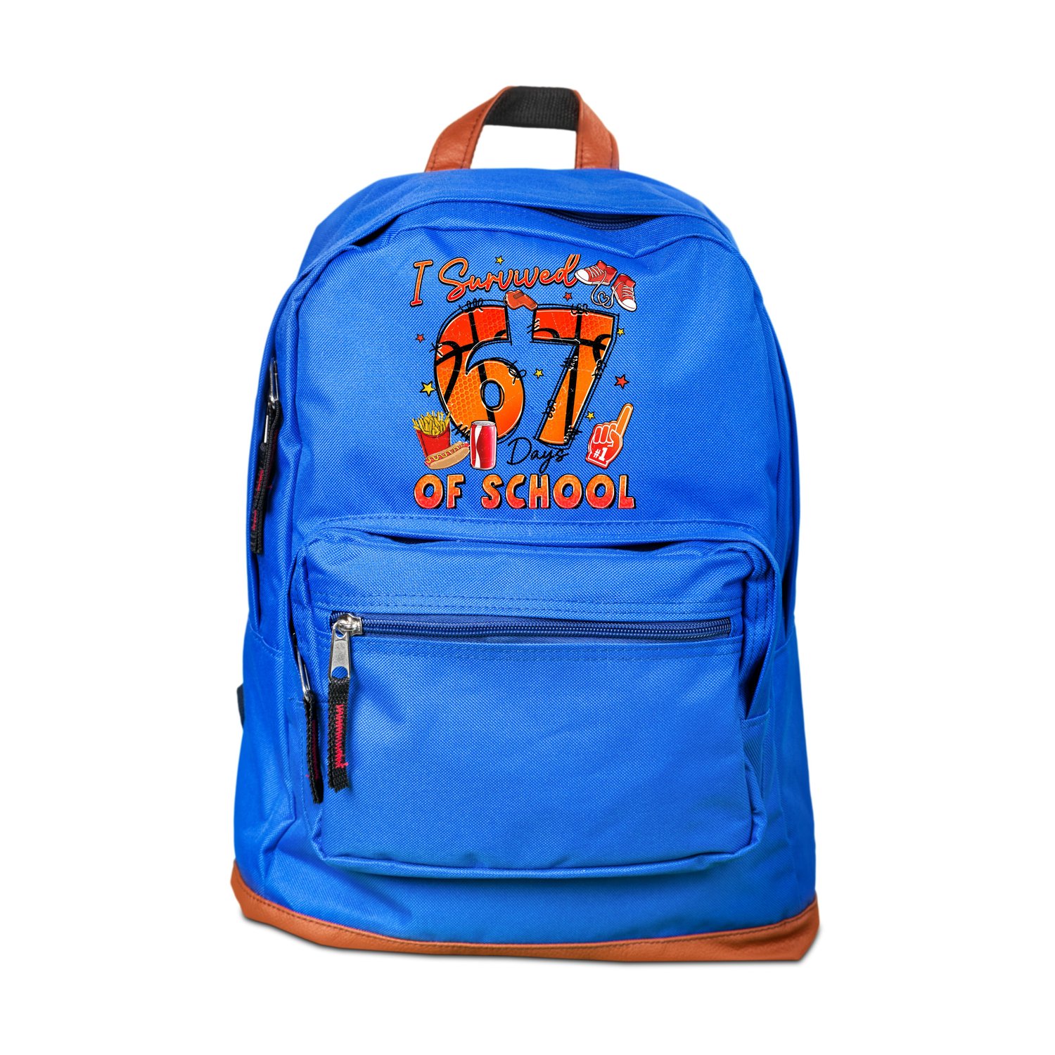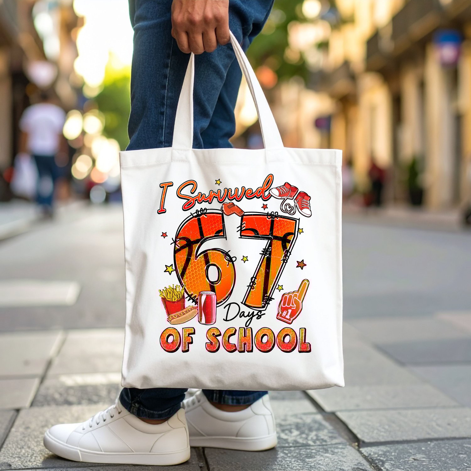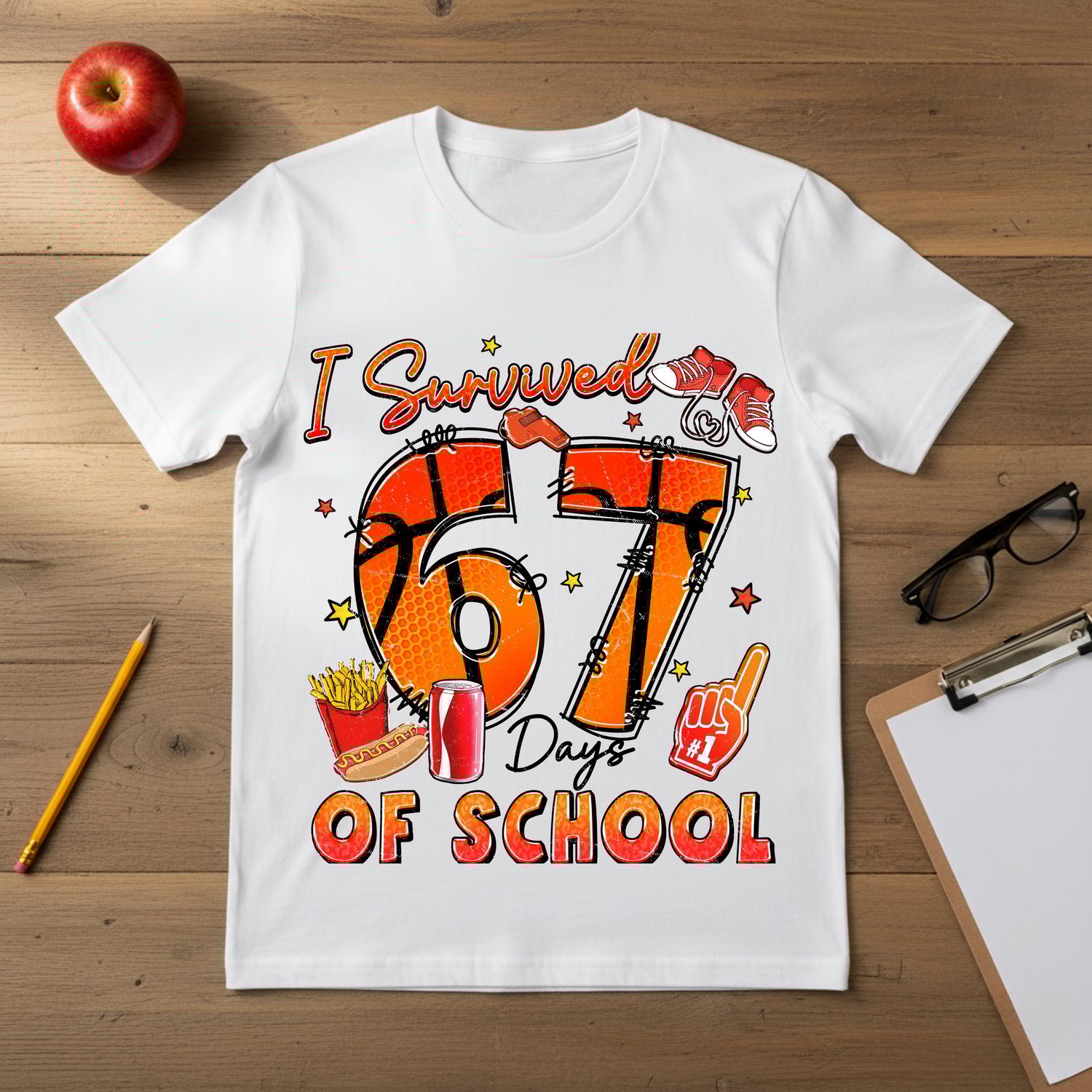 Our "I Survived 67 Days Of School" PNG design is a high-resolution digital graphic that captures the spirit of resilience and fun after completing a significant chunk of the school year. The design features a cool basketball theme with the numbers "67" along with playful elements like sneakers, fries, soda, and a foam finger, giving it a vibrant, celebratory, and trendy aesthetic.