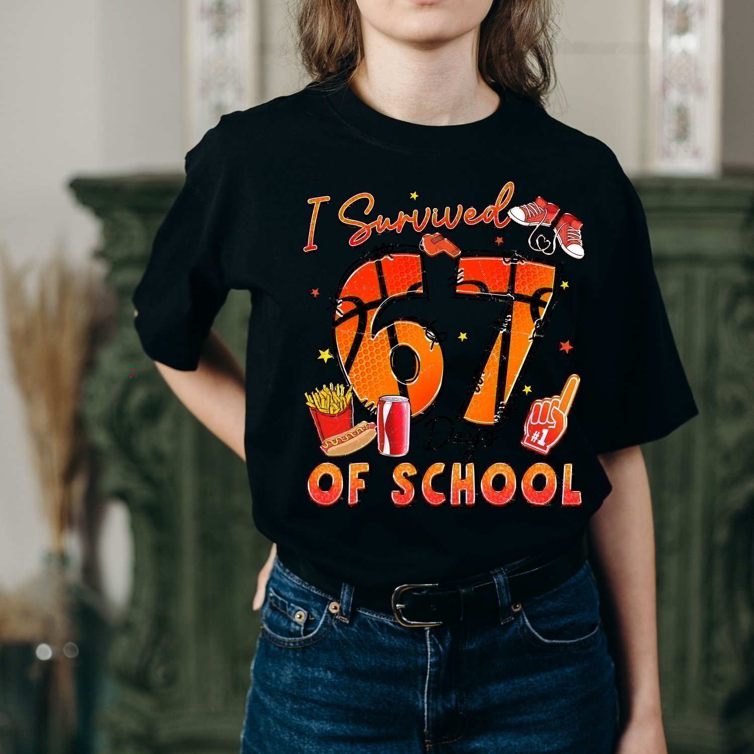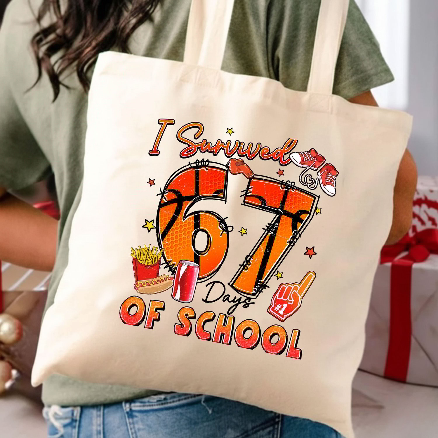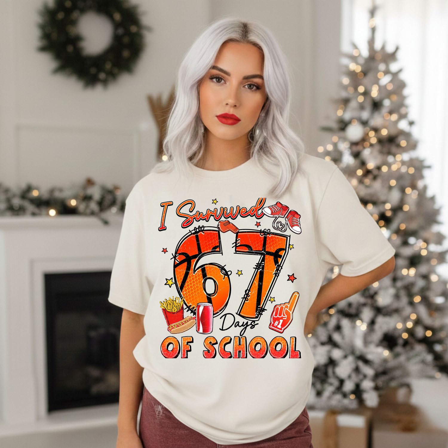 Our "I Survived 67 Days Of School" PNG design is a high-resolution digital graphic that captures the spirit of resilience and fun after completing a significant chunk of the school year. The design features a cool basketball theme with the numbers "67" along with playful elements like sneakers, fries, soda, and a foam finger, giving it a vibrant, celebratory, and trendy aesthetic.